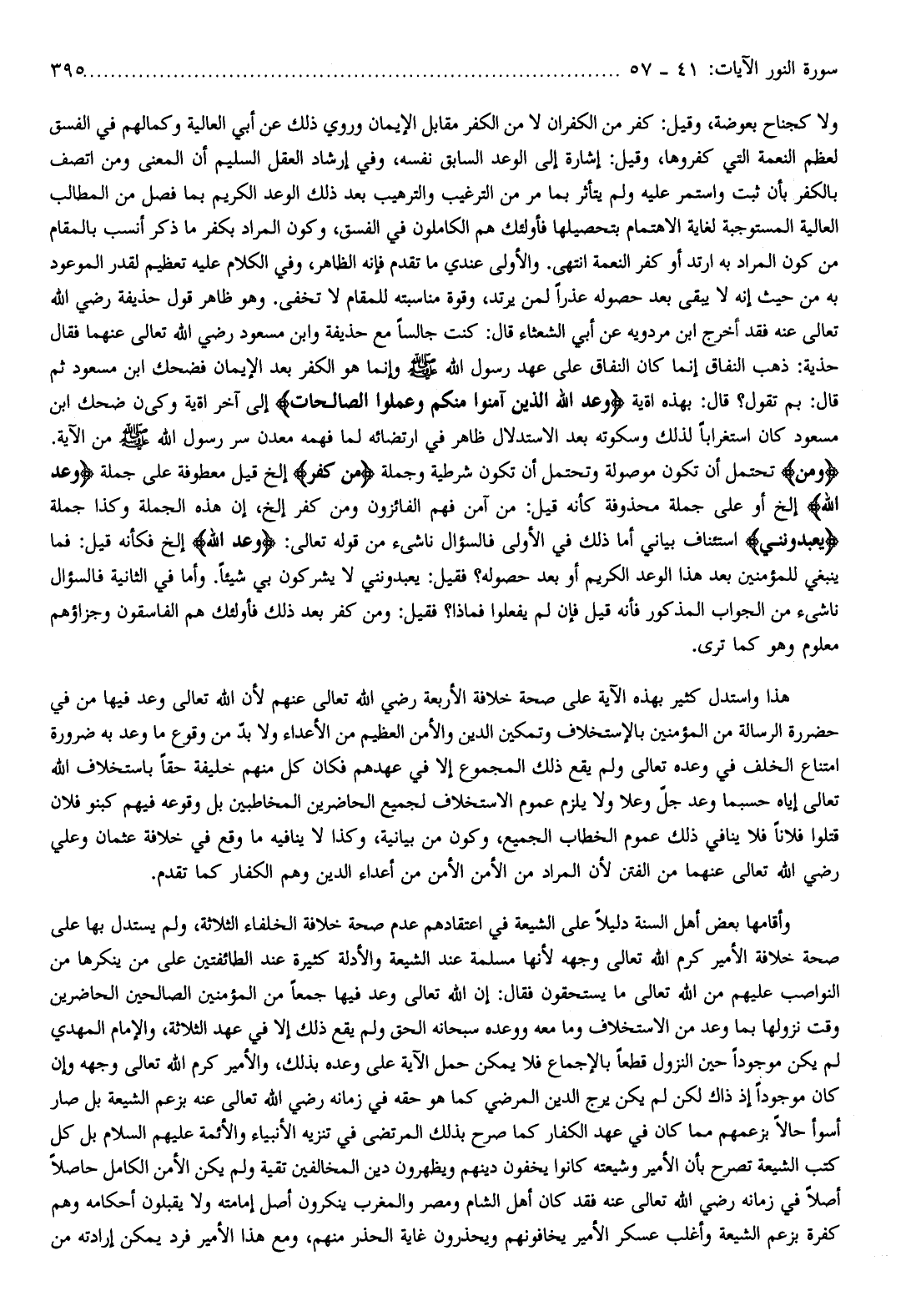 وأقامها بعض أهل السنة دليلا على الشيعة في اعتقادهم عدم صحة خلافة الخلفاء الثلاثة، ولم يستدل بها على صحة خلافة الأمير كرم الله تعالى وجهه لأنها مسلمة عند الشيعة والأدلة كثيرة عند الطائفتين على من ينكرها من النواصب عليهم من الله تعالى ما يستحقون فقال: إن الله تعالى وعد فيها جمعا من المؤمنين الصالحين الحاضرين وقت نزولها بما وعد من الاستخلاف وما معه ووعده سبحانه الحق ولم يقع ذلك إلا في عهد الثلاثة، والإمام المهدي لم يكن موجودا حين النزول قطعا بالإجماع فلا يمكن حمل الآية على وعده بذلك، والأمير كرم الله تعالى وجهه وإن كان موجودا إذ ذاك لكن لم يكن يرج الدين المرضي كما هو حقه في زمانه رضي الله تعالى عنه بزعم الشيعة بل صار أسوأ حالا بزعمهم مما كان في عهد الكفار كما صرح بذلك المرتضى في تنزيه الأنبياء والأئمة عليهم السلام بل كل كتب الشيعة تصرح بأن الأمير وشيعته كانوا يخفون دينهم ويظهرون دين المخالفين تقية ولم يكن الأمن الكامل حاصلا أصلا في زمانه رضي الله تعالى عنه فقد كان أهل الشام ومصر والمغرب ينكرون أصل إمامته ولا يقبلون أحكامه وهم كفرة بزعم الشيعة وأغلب عسكر الأمير يخافونهم ويحذرون غاية الحذر منهم، ومع هذا الأمير فرد يمكن إرادته من
