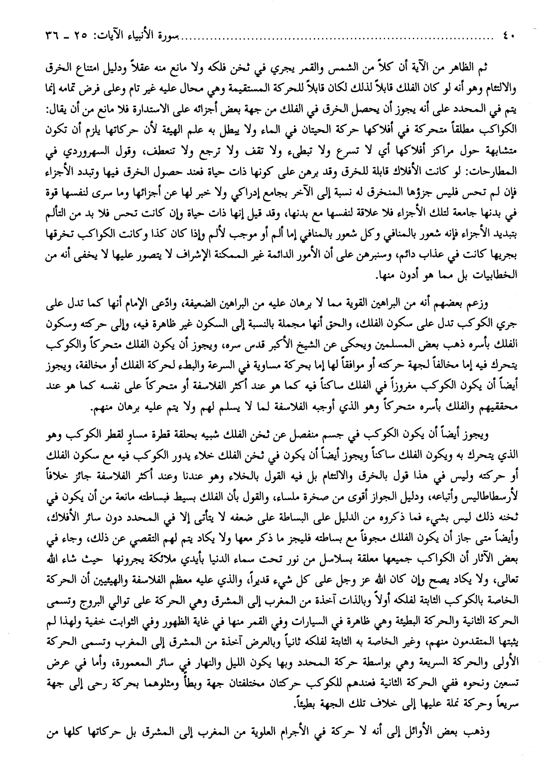 وزعم بعضهم أنه من البراهين القوية مما لا برهان عليه من البراهين الضعيفة، وادّعى الإمام أنها كما تدل على جري الكوكب تدل على سكون الفلك، والحق أنها مجملة بالنسبة إلى السكون غير ظاهرة فيه، وإلى حركته وسكون الفلك بأسره ذهب بعض المسلمين ويحكى عن الشيخ الأكبر قدس سره، ويجوز أن يكون الفلك متحركا والكوكب يتحرك فيه إما مخالفا لجهة حركته أو موافقا لها إما بحركة مساوية في السرعة والبطء لحركة الفلك أو مخالفة، ويجوز أيضا أن يكون الكوكب مغروزا في الفلك ساكنا فيه كما هو عند أكثر الفلاسفة أو متحركا على نفسه كما هو عند محققيهم والفلك بأسره متحركا وهو الذي أوجبه الفلاسفة لما لا يسلم لهم ولا يتم عليه برهان منهم.
