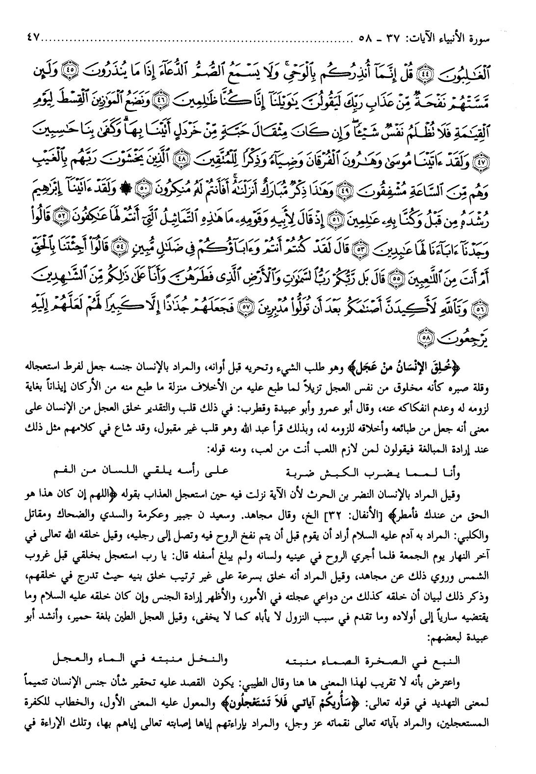خُلِقَ الْإِنْسانُ مِنْ عَجَلٍ وهو طلب الشيء وتحريه قبل أوانه، والمراد بالإنسان جنسه جعل لفرط استعجاله وقلة صبره كأنه مخلوق من نفس العجل تزيلا لما طبع عليه من الأخلاف منزلة ما طبع منه من الأركان إيذانا بغاية لزومه له وعدم انفكاكه عنه، وقال أبو عمرو وأبو عبيدة وقطرب: في ذلك قلب والتقدير خلق العجل من الإنسان على معنى أنه جعل من طبائعه وأخلاقه للزومه له، وبذلك قرأ عبد الله وهو قلب غير مقبول، وقد شاع في كلامهم مثل ذلك عند إرادة المبالغة فيقولون لمن لازم اللعب أنت من لعب، ومنه قوله: