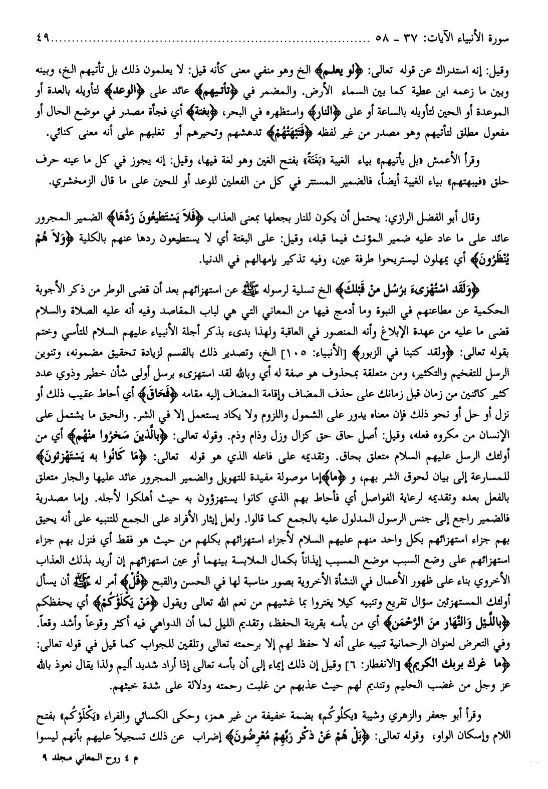 وقال أبو الفضل الرازي: يحتمل أن يكون للنار بجعلها بمعنى العذاب فَلا يَسْتَطِيعُونَ رَدَّها الضمير المجرور عائد على ما عاد عليه ضمير المؤنث فيما قبله، وقيل: على البغتة أي لا يستطيعون ردها عنهم بالكلية وَلا هُمْ يُنْظَرُونَ أي يمهلون ليستريحوا طرفة عين، وفيه تذكير بإمهالهم في الدنيا.
