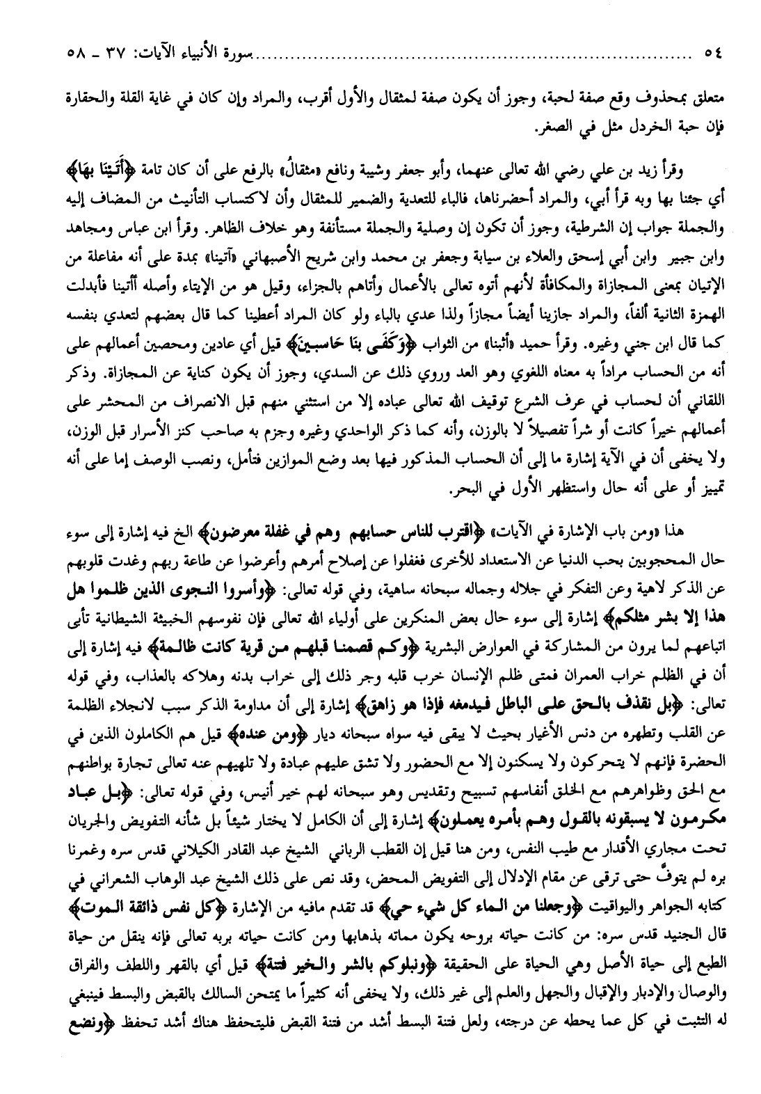 هذا «ومن باب الإشارة في الآيات» اقْتَرَبَ لِلنَّاسِ حِسابُهُمْ وَهُمْ فِي غَفْلَةٍ مُعْرِضُونَ إلخ فيه إشارة إلى سوء حال المحجوبين بحب الدنيا عن الاستعداد للأخرى فغفلوا عن إصلاح أمرهم وأعرضوا عن طاعة ربهم وغدت قلوبهم عن الذكر لاهية وعن التفكر في جلاله وجماله سبحانه ساهية، وفي قوله تعالى: وَأَسَرُّوا النَّجْوَى الَّذِينَ ظَلَمُوا هَلْ هذا إِلَّا بَشَرٌ مِثْلُكُمْ إشارة إلى سوء حال بعض المنكرين على أولياء الله تعالى فإن نفوسهم الخبيثة الشيطانية تأبى اتباعهم لما يرون من المشاركة في العوارض البشرية وَكَمْ قَصَمْنا قبلهم مِنْ قَرْيَةٍ كانَتْ ظالِمَةً فيه إشارة إلى أن في الظلم خراب العمران فمتى ظلم الإنسان خرب قلبه وجر ذلك إلى خراب بدنه وهلاكه بالعذاب، وفي قوله تعالى: بَلْ نَقْذِفُ بِالْحَقِّ عَلَى الْباطِلِ فَيَدْمَغُهُ فَإِذا هُوَ زاهِقٌ إشارة إلى أن مداومة الذكر سبب لانجلاء الظلمة عن القلب وتطهره من دنس الأغيار بحيث لا يبقى فيه سواه سبحانه ديار وَمَنْ عِنْدَهُ قيل هم الكاملون الذين في الحضرة فإنهم لا يتحركون ولا يسكنون إلا مع الحضور ولا تشق عليهم عبادة ولا تلهيهم عنه تعالى تجارة بواطنهم مع الحق وظواهرهم مع الخلق أنفاسهم تسبيح وتقديس وهو سبحانه لهم خير أنيس، وفي قوله تعالى: بَلْ عِبادٌ مُكْرَمُونَ لا يَسْبِقُونَهُ بِالْقَوْلِ وَهُمْ بِأَمْرِهِ يَعْمَلُونَ إشارة إلى أن الكامل لا يختار شيئا بل شأنه التفويض والجريان تحت مجاري الأقدار مع طيب النفس، ومن هنا قيل إن القطب الرباني الشيخ عبد القادر الكيلاني قدس سره وغمرنا بره لم يتوفّ حتى ترقى عن مقام الإدلال إلى التفويض المحض، وقد نص على ذلك الشيخ عبد الوهاب الشعراني في كتابه الجواهر واليواقيت وَجَعَلْنا مِنَ الْماءِ كُلَّ شَيْءٍ حَيٍّ قد تقدم ما فيه من الإشارة كُلُّ نَفْسٍ ذائِقَةُ الْمَوْتِ قال الجنيد قدس سره: من كانت حياته بروحه يكون مماته بذهابها ومن كانت حياته بربه تعالى فإنه ينقل من حياة الطبع إلى حياة الأصل وهي الحياة على الحقيقة وَنَبْلُوكُمْ بِالشَّرِّ وَالْخَيْرِ فِتْنَةً قيل أي بالقهر واللطف والفراق والوصال والإدبار والإقبال والجهل والعلم إلى غير ذلك، ولا يخفى أنه كثيرا ما يمتحن السالك بالقبض والبسط فينبغي له التثبت في كل عما يحطه عن درجته، ولعل فتنة البسط أشد من فتنة القبض فليتحفظ هناك أشد تحفظ وَنَضَعُ