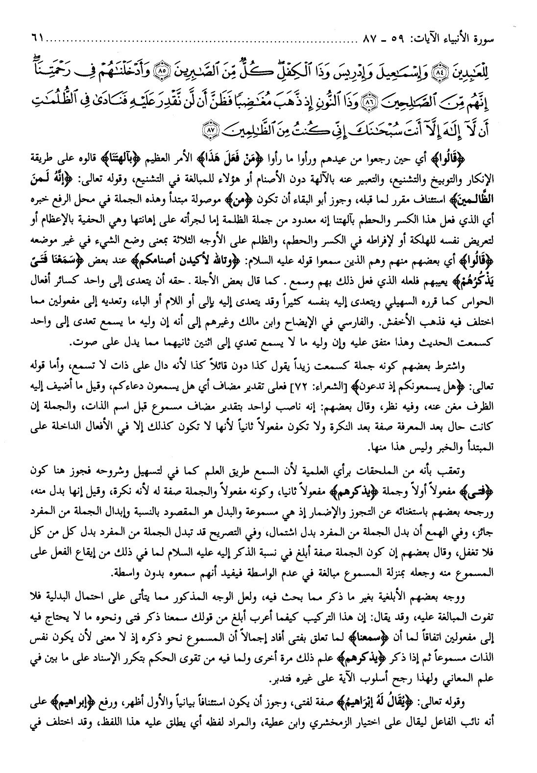 قالُوا أي حين رجعوا من عيدهم ورأوا ما رأوا مَنْ فَعَلَ هذا الأمر العظيم بِآلِهَتِنا قالوه على طريقة الإنكار والتوبيخ والتشنيع، والتعبير عنه بالآلهة دون الأصنام أو هؤلاء للمبالغة في التشنيع، وقوله تعالى: إِنَّهُ لَمِنَ الظَّالِمِينَ استئناف مقرر لما قبله، وجوز أبو البقاء أن تكون مَنْ موصولة مبتدأ وهذه الجملة في محل الرفع خبره أي الذي فعل هذا الكسر والحطم بآلهتنا إنه معدود من جملة الظلمة إما لجرأته على إهانتها وهي الحفية بالإعظام أو لتعريض نفسه للهلكة أو لإفراطه في الكسر والحطم، والظلم على الأوجه الثلاثة بمعنى وضع الشيء في غير موضعه قالُوا أي بعضهم منهم وهم الذين سمعوا قوله عليه السلام: وَتَاللَّهِ لَأَكِيدَنَّ أَصْنامَكُمْ عند بعض سَمِعْنا فَتًى يَذْكُرُهُمْ يعيبهم فلعله الذي فعل ذلك بهم وسمع. كما قال بعض الأجلة. حقه أن يتعدى إلى واحد كسائر أفعال الحواس كما قرره السهيلي ويتعدى إليه بنفسه كثيرا وقد يتعدى إليه بإلى أو اللام أو الباء، وتعديه إلى مفعولين مما اختلف فيه فذهب الأخفش. والفارسي في الإيضاح وابن مالك وغيرهم إلى أنه إن وليه ما يسمع تعدى إلى واحد كسمعت الحديث وهذا متفق عليه وإن وليه ما لا يسمع تعدي إلى اثنين ثانيهما مما يدل على صوت.
