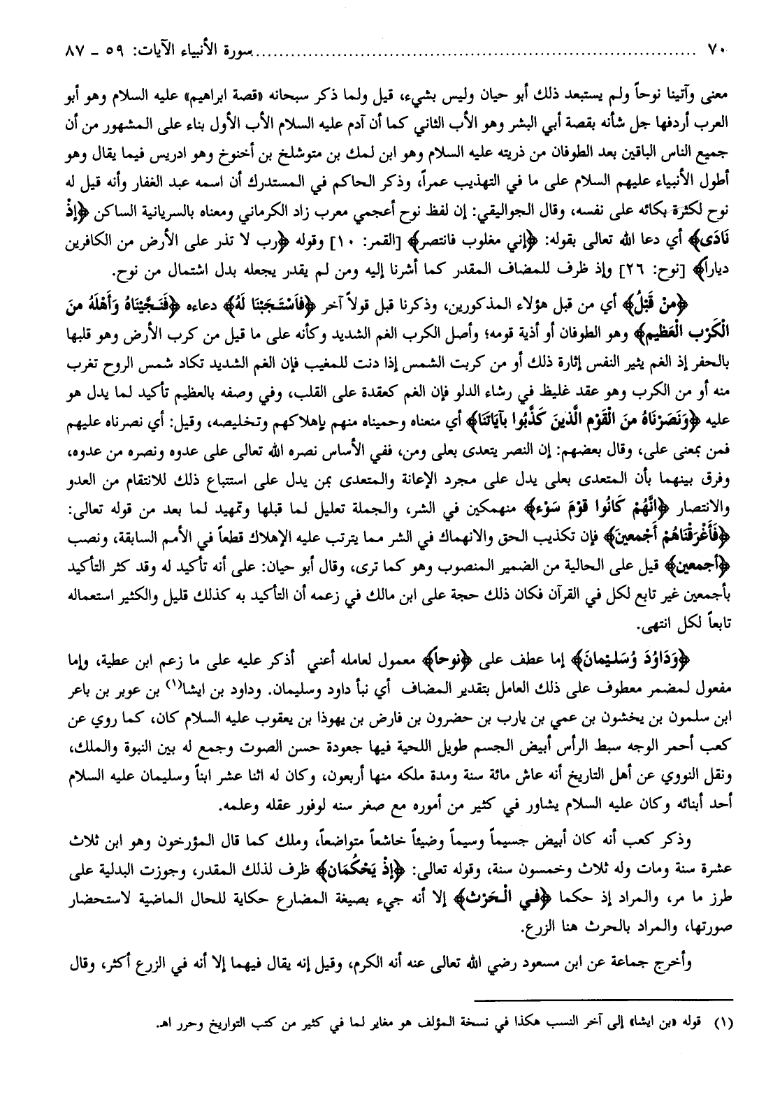 وَداوُدَ وَسُلَيْمانَ إما عطف على نُوحاً معمول لعامله أعني أذكر عليه على ما زعم ابن عطية، وإما مفعول لمضمر معطوف على ذلك العامل بتقدير المضاف أي نبأ داود وسليمان. وداود بن ايشا (¬1) بن عوبر بن باعر ابن سلمون بن يخشون بن عمي بن يا رب بن حضرون بن فارض بن يهوذا بن يعقوب عليه السلام كان، كما روي عن كعب أحمر الوجه سبط الرأس أبيض الجسم طويل اللحية فيها جعودة حسن الصوت وجمع له بين النبوة والملك، ونقل النووي عن أهل التاريخ أنه عاش مائة سنة ومدة ملكه منها أربعون، وكان له اثنا عشر ابنا وسليمان عليه السلام أحد أبنائه وكان عليه السلام يشاور في كثير من أموره مع صغر سنه لوفور عقله وعلمه.