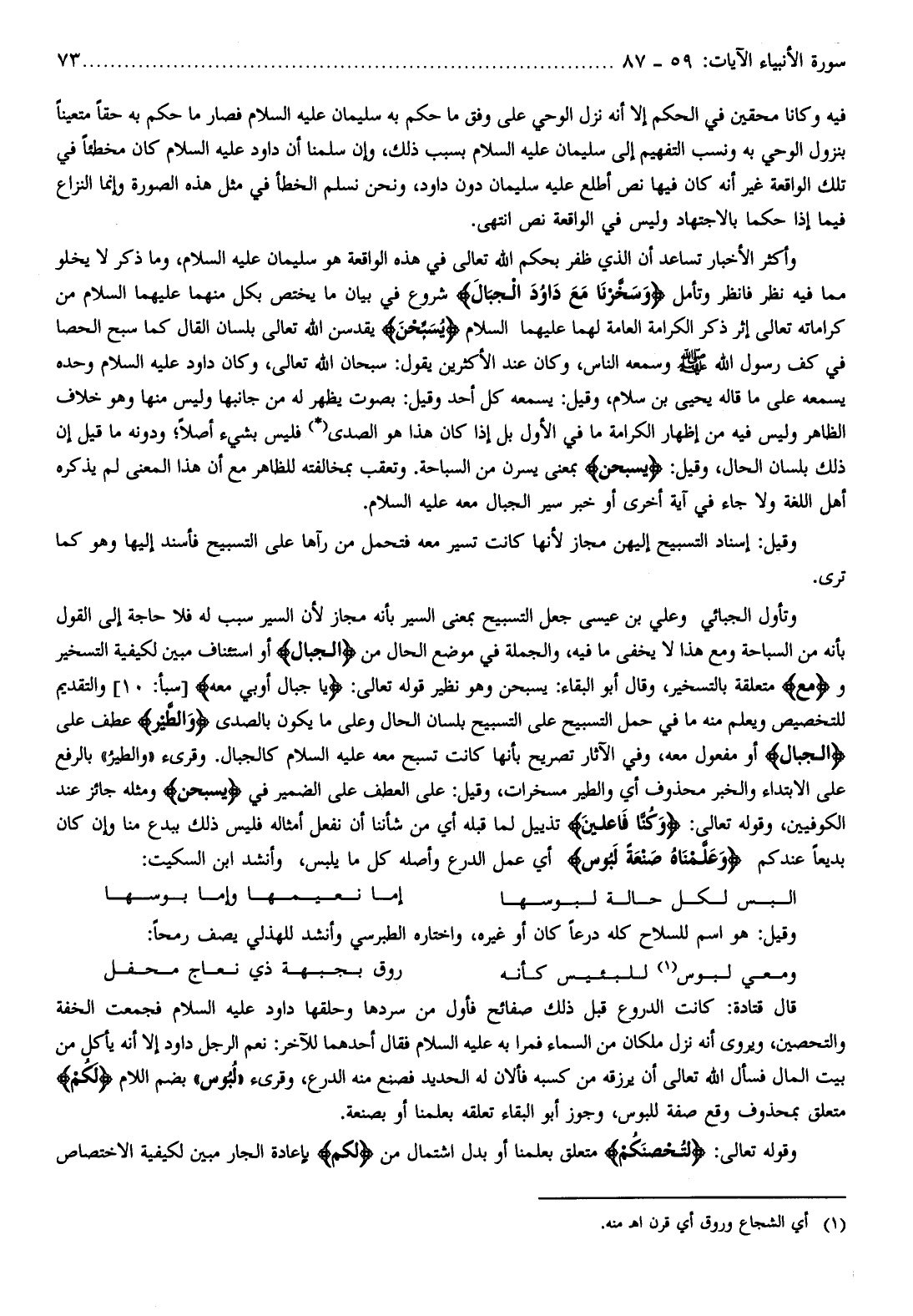 وتأول الجبائي وعلي بن عيسى جعل التسبيح بمعنى السير بأنه مجاز لأن السير سبب له فلا حاجة إلى القول بأنه من السباحة ومع هذا لا يخفى ما فيه، والجملة في موضع الحال من الْجِبالَ أو استئناف مبين لكيفية التسخير ومَعَ متعلقة بالتسخير، وقال أبو البقاء: يسبحن وهو نظير قوله تعالى: يا جِبالُ أَوِّبِي مَعَهُ [سبأ: 10] والتقديم للتخصيص ويعلم منه ما في حمل التسبيح على التسبيح بلسان الحال وعلى ما يكون بالصدى وَالطَّيْرَ عطف على الْجِبالَ أو مفعول معه، وفي الآثار تصريح بأنها كانت تسبح معه عليه السلام كالجبال. وقرىء «والطير» بالرفع على الابتداء والخبر محذوف أي والطير مسخرات، وقيل: على العطف على الضمير في يُسَبِّحْنَ ومثله جائز عند الكوفيين، وقوله تعالى: وَكُنَّا فاعِلِينَ تذييل لما قبله أي من شأننا أن نفعل أمثاله فليس ذلك ببدع منا وإن كان بديعا عندكم وَعَلَّمْناهُ صَنْعَةَ لَبُوسٍ أي عمل الدرع وأصله كل ما يلبس، وأنشد ابن السكيت:
