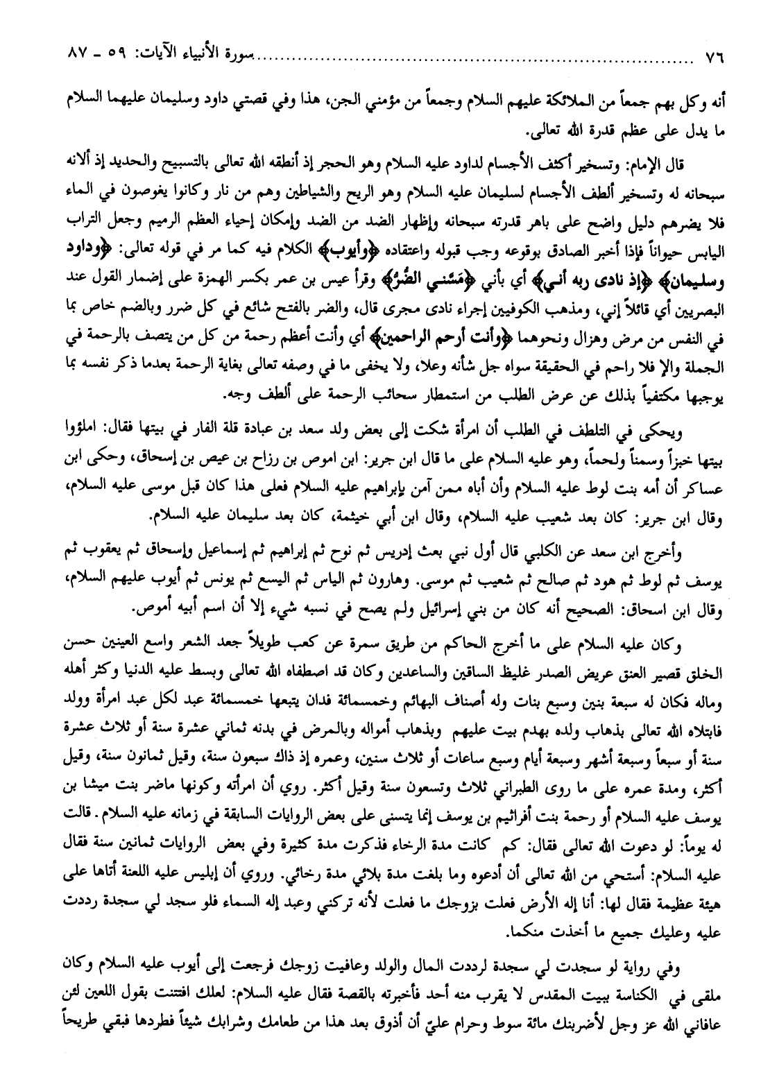 قال الإمام: وتسخير أكثف الأجسام لداود عليه السلام وهو الحجر إذ أنطقه الله تعالى بالتسبيح والحديد إذ ألانه سبحانه له وتسخير ألطف الأجسام لسليمان عليه السلام وهو الريح والشياطين وهم من نار وكانوا يغوصون في الماء فلا يضرهم دليل واضح على باهر قدرته سبحانه وإظهار الضد من الضد وإمكان إحياء العظم الرميم وجعل التراب اليابس حيوانا فإذا أخبر الصادق بوقوعه وجب قبوله واعتقاده وَأَيُّوبَ الكلام فيه كما مر في قوله تعالى: وَداوُدَ وَسُلَيْمانَ إِذْ نادى رَبَّهُ أَنِّي أي بأني مَسَّنِيَ الضُّرُّ وقرأ عيس بن عمر بكسر الهمزة على إضمار القول عند البصريين أي قائلا إني، ومذهب الكوفيين إجراء نادى مجرى قال، والضر بالفتح شائع في كل ضرر وبالضم خاص بما في النفس من مرض وهزال ونحوهما وَأَنْتَ أَرْحَمُ الرَّاحِمِينَ أي وأنت أعظم رحمة من كل من يتصف بالرحمة في الجملة وإلا فلا راحم في الحقيقة سواه جل شأنه وعلا، ولا يخفى ما في وصفه تعالى بغاية الرحمة بعد ما ذكر نفسه بما يوجبها مكتفيا بذلك عن عرض الطلب من استمطار سحائب الرحمة على ألطف وجه.