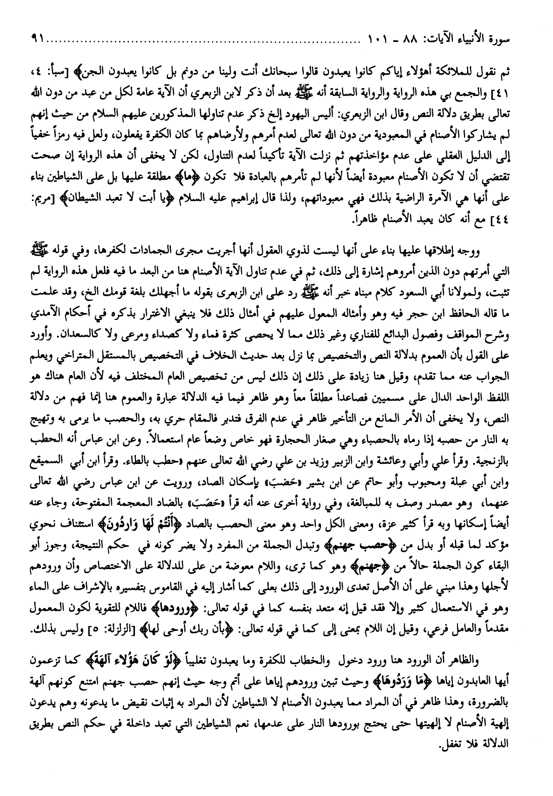 ووجه إطلاقها عليها بناء على أنها ليست لذوي العقول أنها أجريت مجرى الجمادات لكفرها، وفي قوله صلّى الله عليه وسلّم التي أمرتهم دون الذين أمروهم إشارة إلى ذلك، ثم في عدم تناول الآية الأصنام هنا من البعد ما فيه فلعل هذه الرواية لم تثبت، ولمولانا أبي السعود كلام مبناه خبر أنه صلّى الله عليه وسلّم رد على ابن الزبعرى بقوله ما أجهلك بلغة قومك إلخ، وقد علمت ما قاله الحافظ ابن حجر فيه وهو وأمثاله المعول عليهم في أمثال ذلك فلا ينبغي الاغترار بذكره في أحكام الآمدي وشرح المواقف وفصول البدائع للفناري وغير ذلك مما لا يحصى كثرة فماء ولا كصداء ومرعى ولا كالسعدان. وأورد على القول بأن العموم بدلالة النص والتخصيص بما نزل بعد حديث الخلاف في التخصيص بالمستقل المتراخي ويعلم الجواب عنه مما تقدم، وقيل هنا زيادة على ذلك إن ذلك ليس من تخصيص العام المختلف فيه لأن العام هناك هو اللفظ الواحد الدال على مسميين فصاعدا مطلقا معا وهو ظاهر فيما فيه الدلالة عبارة والعموم هنا إنما فهم من دلالة النص، ولا يخفى أن الأمر المانع من التأخير ظاهر في عدم الفرق فتدبر فالمقام حري به، والحصب ما يرمى به وتهيج به النار من حصبه إذا رماه بالحصباء وهي صغار الحجارة فهو خاص وضعا عام استعمالا. وعن ابن عباس أنه الحطب بالزنجية. وقرأ علي وأبي وعائشة وابن الزبير وزيد بن علي رضي الله تعالى عنهم «حطب بالطاء. وقرأ ابن أبي السميقع وابن أبي عبلة ومحبوب وأبو حاتم عن ابن بشير «حضب» بإسكان الصاد، ورويت عن ابن عباس رضي الله تعالى عنهما، وهو مصدر وصف به للمبالغة، وفي رواية أخرى عنه أنه قرأ «حصب» بالضاد المعجمة المفتوحة، وجاء عنه أيضا إسكانها وبه قرأ كثير عزة، ومعنى الكل واحد وهو معنى الحصب بالصاد أَنْتُمْ لَها وارِدُونَ استئناف نحوي مؤكد لما قبله أو بدل من حَصَبُ جَهَنَّمَ وتبدل الجملة من المفرد ولا يضر كونه في حكم النتيجة، وجوز أبو البقاء كون الجملة حالا من جَهَنَّمَ وهو كما ترى، واللام معوضة من على للدلالة على الاختصاص وأن ورودهم لأجلها وهذا مبني على أن الأصل تعدى الورود إلى ذلك بعلى كما أشار إليه في القاموس بتفسيره بالإشراف على الماء وهو في الاستعمال كثير وإلا فقد قيل إنه متعد بنفسه كما في قوله تعالى: وَرَدُوها فاللام للتقوية لكون المعمول مقدما والعامل فرعي، وقيل إن اللام بمعنى إلى كما في قوله تعالى: بِأَنَّ رَبَّكَ أَوْحى لَها [الزلزلة: 5] وليس بذلك.