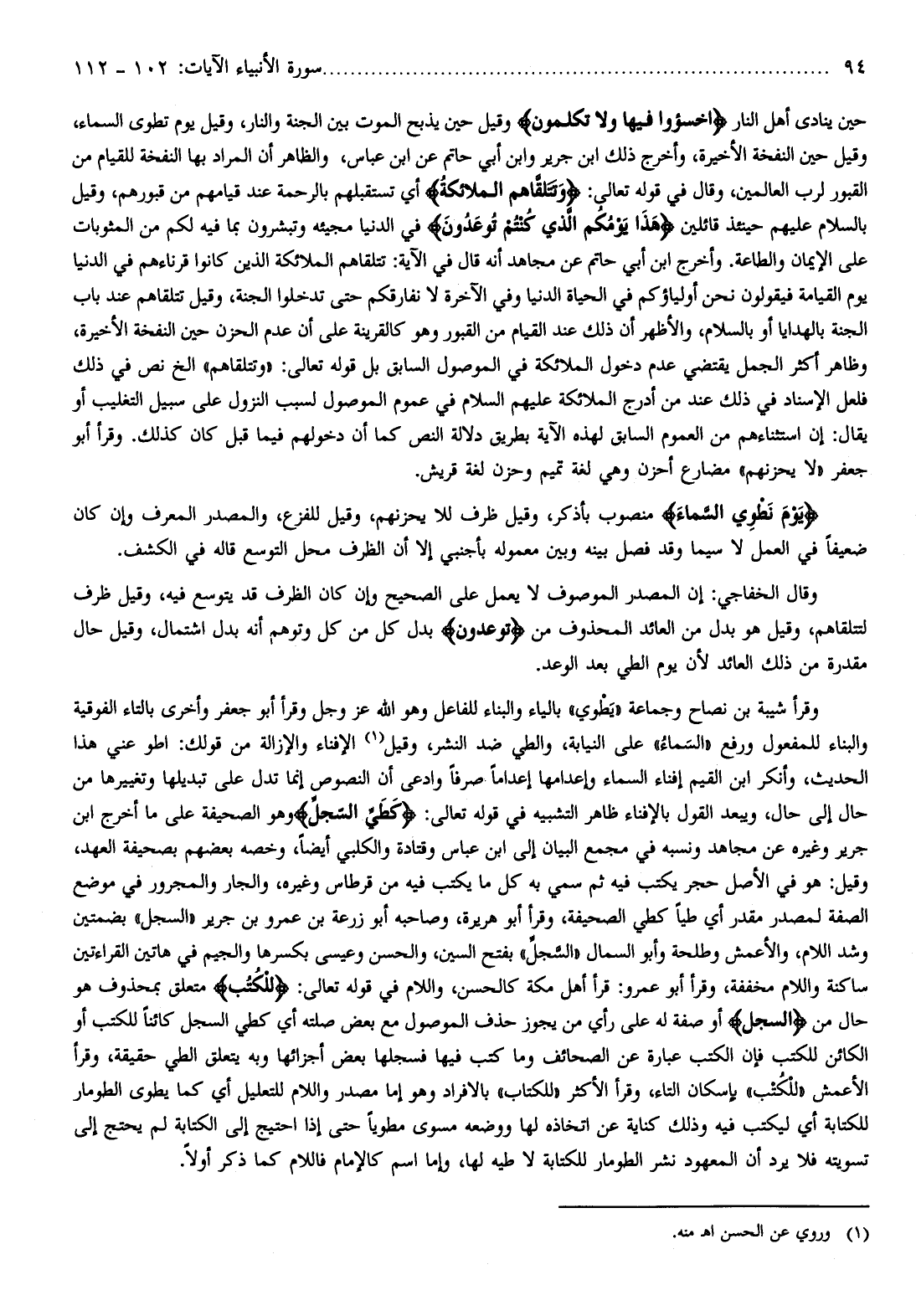 وقال الخفاجي: إن المصدر الموصوف لا يعمل على الصحيح وإن كان الظرف قد يتوسع فيه، وقيل ظرف لتتلقاهم، وقيل هو بدل من العائد المحذوف من تُوعَدُونَ بدل كل من كل وتوهم أنه بدل اشتمال، وقيل حال مقدرة من ذلك العائد لأن يوم الطي بعد الوعد.