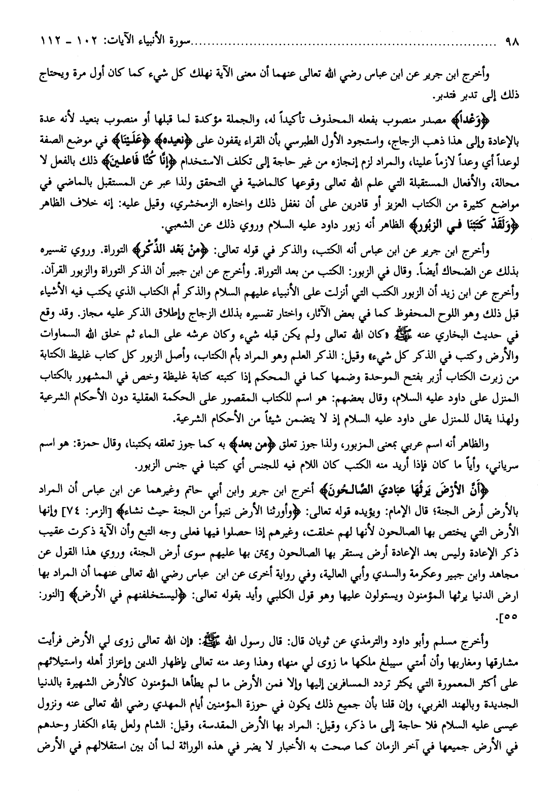 أَنَّ الْأَرْضَ يَرِثُها عِبادِيَ الصَّالِحُونَ أخرج ابن جرير وابن أبي حاتم وغيرهما عن ابن عباس أن المراد بالأرض أرض الجنة قال الإمام: ويؤيده قوله تعالى: وَأَوْرَثَنَا الْأَرْضَ نَتَبَوَّأُ مِنَ الْجَنَّةِ حَيْثُ نَشاءُ [الزمر: 74] وإنها الأرض التي يختص بها الصالحون لأنها لهم خلقت، وغيرهم إذا حصلوا فيها فعلى وجه التبع وأن الآية ذكرت عقيب ذكر الإعادة وليس بعد الإعادة أرض يستقر بها الصالحون ويمتن بها عليهم سوى أرض الجنة، وروي هذا القول عن مجاهد وابن جبير وعكرمة والسدي وأبي العالية، وفي رواية أخرى عن ابن عباس رضي الله تعالى عنهما أن المراد بها ارض الدنيا يرثها المؤمنون ويستولون عليها وهو قول الكلبي وأيد بقوله تعالى: لَيَسْتَخْلِفَنَّهُمْ فِي الْأَرْضِ [النور: