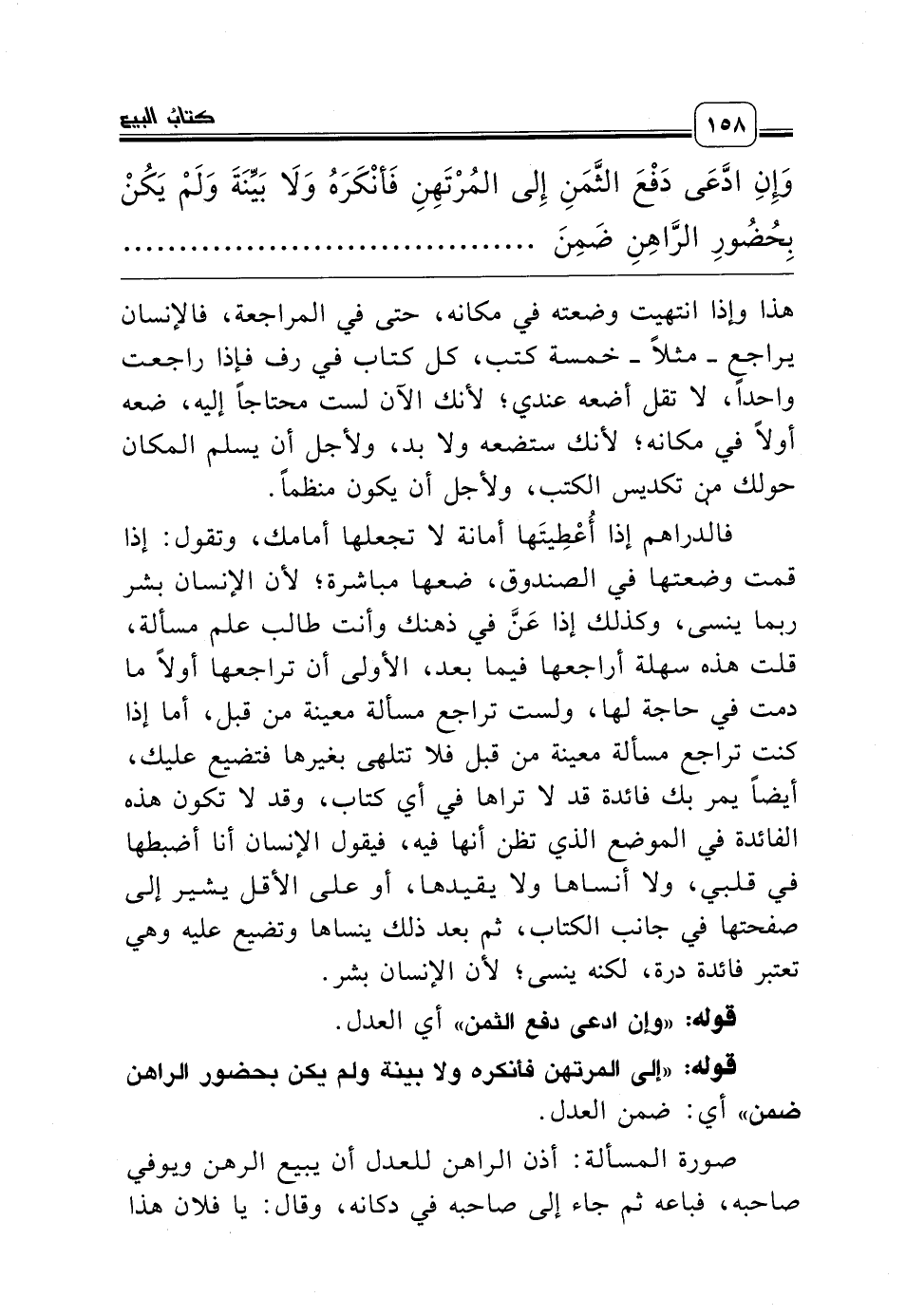 فالدراهم إذا أُعْطِيتَها أمانة لا تجعلها أمامك، وتقول: إذا قمت وضعتها في الصندوق، ضعها مباشرة؛ لأن الإنسان بشر ربما ينسى، وكذلك إذا عَنَّ في ذهنك وأنت طالب علم مسألة، قلت هذه سهلة أراجعها فيما بعد، الأولى أن تراجعها أولاً ما دمت في حاجة لها، ولست تراجع مسألة معينة من قبل، أما إذا كنت تراجع مسألة معينة من قبل فلا تتلهى بغيرها فتضيع عليك، أيضاً يمر بك فائدة قد لا تراها في أي كتاب، وقد لا تكون هذه الفائدة في الموضع الذي تظن أنها فيه، فيقول الإنسان أنا أضبطها في قلبي، ولا أنساها ولا يقيدها، أو على الأقل يشير إلى صفحتها في جانب الكتاب، ثم بعد ذلك ينساها وتضيع عليه وهي تعتبر فائدة درة، لكنه ينسى؛ لأن الإنسان بشر.