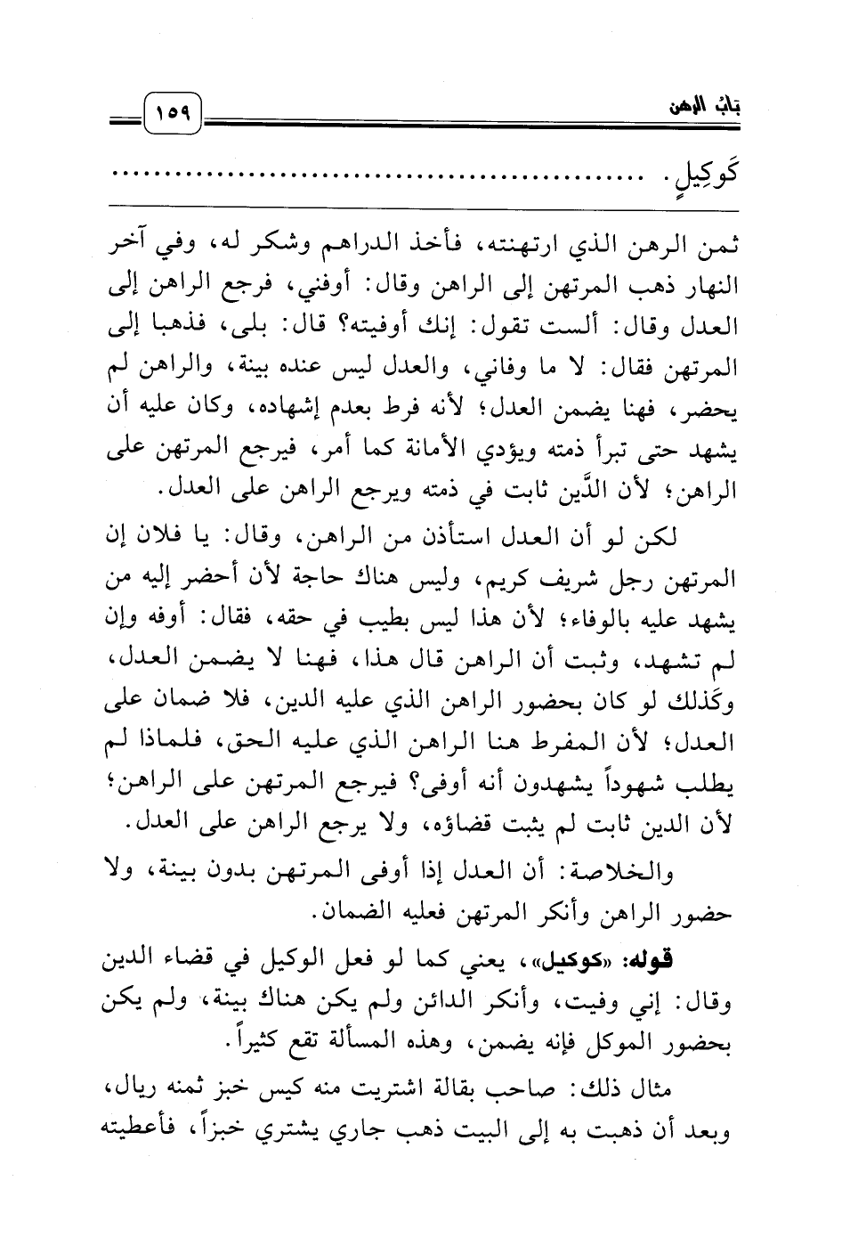 ثمن الرهن الذي ارتهنته، فأخذ الدراهم وشكر له، وفي آخر النهار ذهب المرتهن إلى الراهن وقال: أوفني، فرجع الراهن إلى العدل وقال: ألست تقول: إنك أوفيته؟ قال: بلى، فذهبا إلى المرتهن فقال: لا ما وفاني، والعدل ليس عنده بينة، والراهن لم يحضر، فهنا يضمن العدل؛ لأنه فرط بعدم إشهاده، وكان عليه أن يشهد حتى تبرأ ذمته ويؤدي الأمانة كما أمر، فيرجع المرتهن على الراهن؛ لأن الدَّين ثابت في ذمته ويرجع الراهن على العدل.