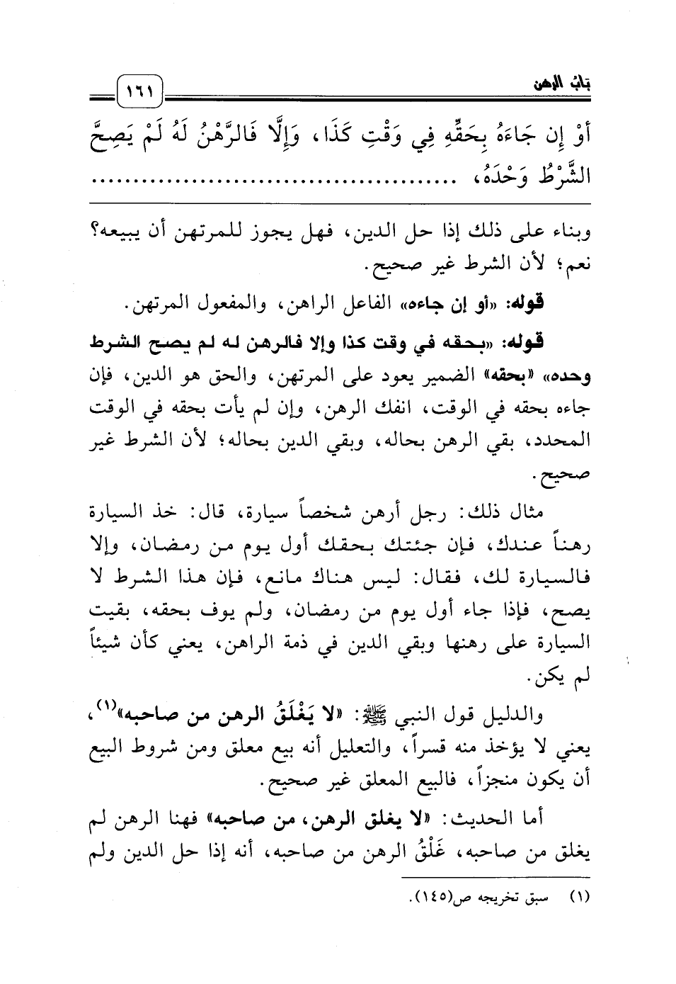 قوله: «بحقه في وقت كذا وإلا فالرهن له لم يصح الشرط وحده» «بحقه» الضمير يعود على المرتهن، والحق هو الدين، فإن جاءه بحقه في الوقت، انفك الرهن، وإن لم يأت بحقه في الوقت المحدد، بقي الرهن بحاله، وبقي الدين بحاله؛ لأن الشرط غير صحيح.