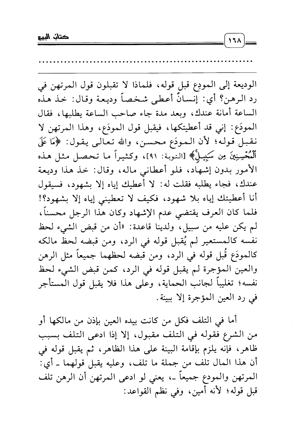 الوديعة إلى المودِع قبل قوله، فلماذا لا تقبلون قول المرتهن في رد الرهن؟ أي: إنسانٌ أعطى شخصاً وديعة وقال: خذ هذه الساعة أمانة عندك، وبعد مدة جاء صاحب الساعة يطلبها، فقال المودَع: إني قد أعطيتكها، فيقبل قول المودَع، وهذا المرتهن لا نقبل قوله؛ لأن المودَع محسن، والله تعالى يقول: {مَا عَلَى الْمُحْسِنِينَ مِنْ سَبِيلٍ} [التوبة: 91]، وكثيراً ما تحصل مثل هذه الأمور بدون إشهاد، فلو أعطاني ماله، وقال: خذ هذا وديعة عندك، فجاء يطلبه فقلت له: لا أعطيك إياه إلا بشهود، فسيقول أنا أعطيتك إياه بلا شهود، فكيف لا تعطيني إياه إلا بشهود؟! فلما كان العرف يقتضي عدم الإشهاد وكان هذا الرجل محسناً، لم يكن عليه من سبيل، ولدينا قاعدة: «أن من قبض الشيء لحظ نفسه كالمستعير لم يُقبل قوله في الرد، ومن قبضه لحظ مالكه كالمودَع قُبل قوله في الرد، ومن قبضه لحظهما جميعاً مثل الرهن والعين المؤجرة لم يقبل قوله في الرد، كمن قبض الشيء لحظ نفسه؛ تغليباً لجانب الحماية، وعلى هذا فلا يقبل قول المستأجر في رد العين المؤجرة إلا ببينة.