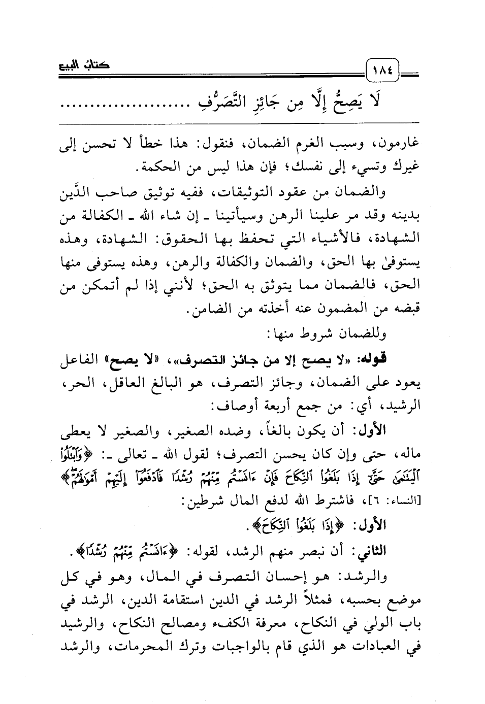 قوله: «لا يصح إلا من جائز التصرف»، «لا يصح» الفاعل يعود على الضمان، وجائز التصرف، هو البالغ العاقل، الحر، الرشيد، أي: من جمع أربعة أوصاف: