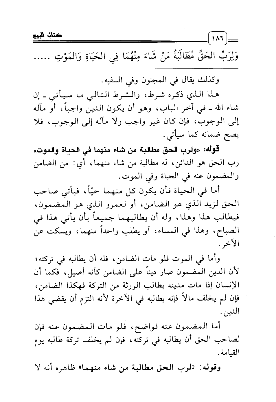 قوله: «ولرب الحق مطالبة من شاء منهما في الحياة والموت» رب الحق هو الدائن، له مطالبة من شاء منهما، أي: من الضامن والمضمون عنه في الحياة وفي الموت.