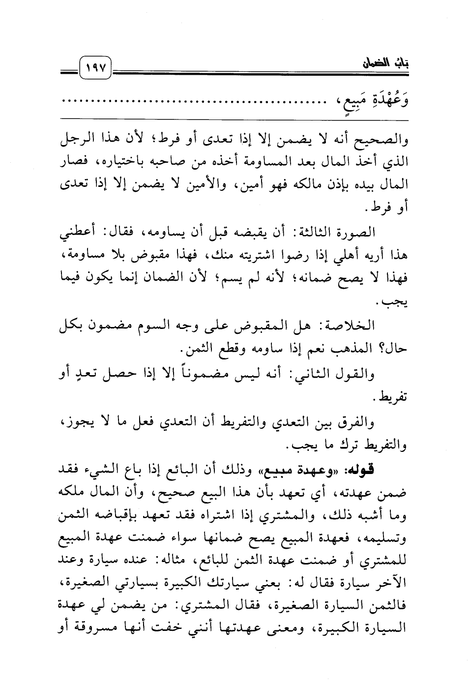 قوله: «وعهدة مبيع» وذلك أن البائع إذا باع الشيء فقد ضمن عهدته، أي تعهد بأن هذا البيع صحيح، وأن المال ملكه وما أشبه ذلك، والمشتري إذا اشتراه فقد تعهد بإقباضه الثمن وتسليمه، فعهدة المبيع يصح ضمانها سواء ضمنت عهدة المبيع للمشتري أو ضمنت عهدة الثمن للبائع، مثاله: عنده سيارة وعند الآخر سيارة فقال له: بعني سيارتك الكبيرة بسيارتي الصغيرة، فالثمن السيارة الصغيرة، فقال المشتري: من يضمن لي عهدة السيارة الكبيرة، ومعنى عهدتها أنني خفت أنها مسروقة أو