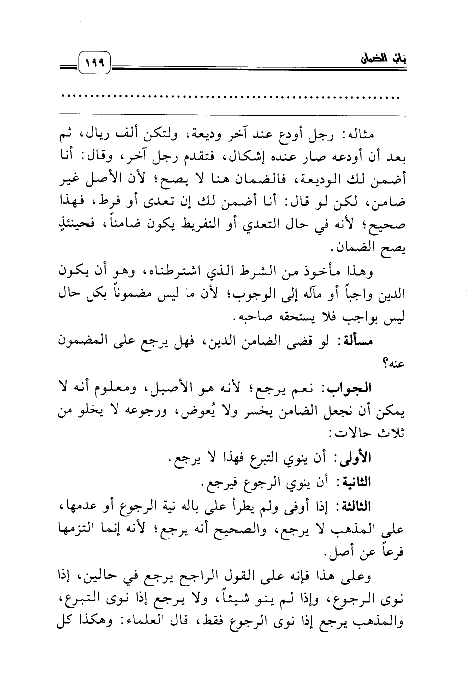 الجواب: نعم يرجع؛ لأنه هو الأصيل، ومعلوم أنه لا يمكن أن نجعل الضامن يخسر ولا يُعوض، ورجوعه لا يخلو من ثلاث حالات: