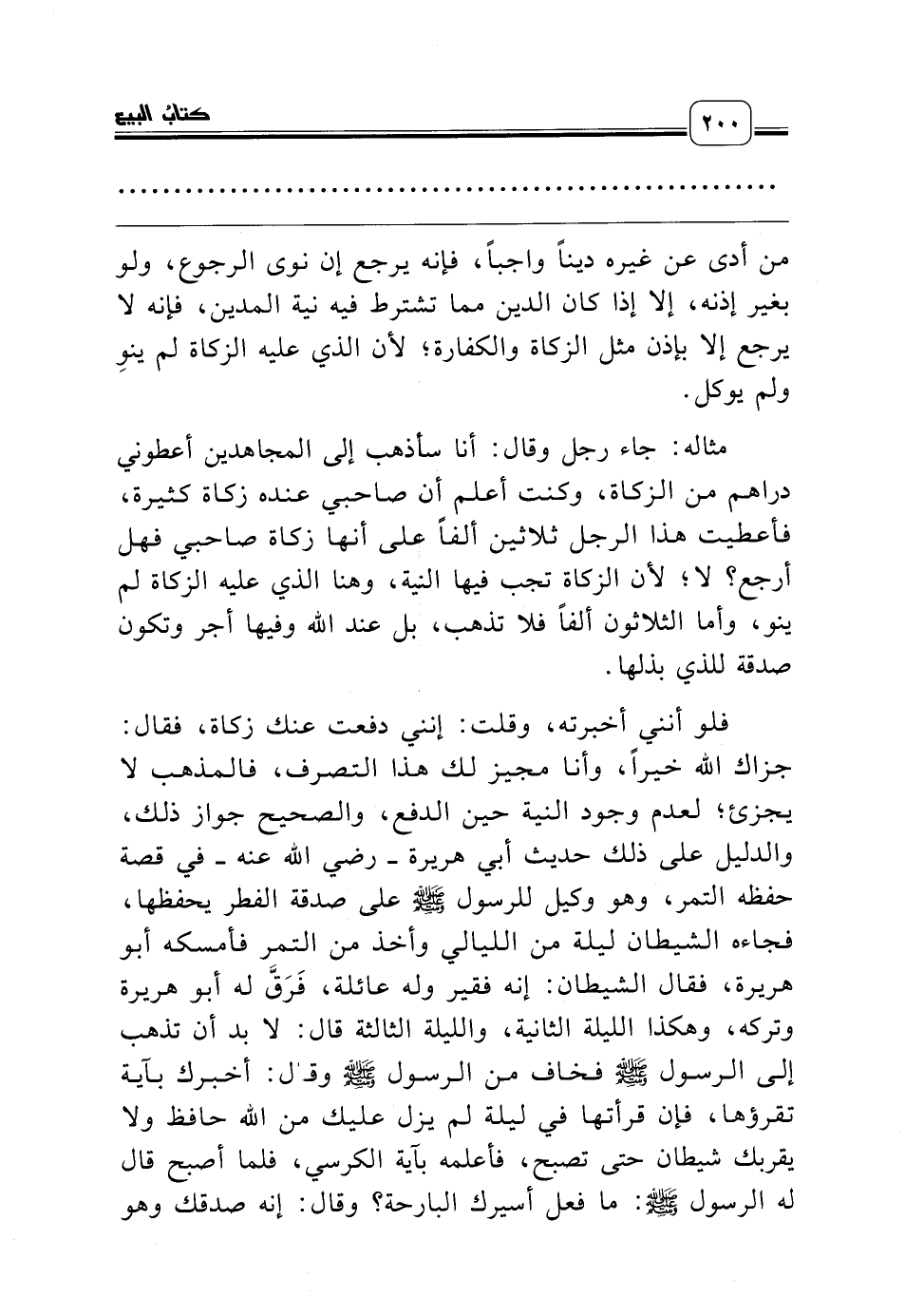 فلو أنني أخبرته، وقلت: إنني دفعت عنك زكاة، فقال: جزاك الله خيراً، وأنا مجيز لك هذا التصرف، فالمذهب لا يجزئ؛ لعدم وجود النية حين الدفع، والصحيح جواز ذلك، والدليل على ذلك حديث أبي هريرة ـ رضي الله عنه ـ في قصة حفظه التمر، وهو وكيل للرسول صلّى الله عليه وسلّم على صدقة الفطر يحفظها، فجاءه الشيطان ليلة من الليالي وأخذ من التمر فأمسكه أبو هريرة، فقال الشيطان: إنه فقير وله عائلة، فَرَقَّ له أبو هريرة وتركه، وهكذا الليلة الثانية، والليلة الثالثة قال: لا بد أن تذهب إلى الرسول صلّى الله عليه وسلّم فخاف من الرسول صلّى الله عليه وسلّم وقال: أخبرك بآية تقرؤها، فإن قرأتها في ليلة لم يزل عليك من الله حافظ ولا يقربك شيطان حتى تصبح، فأعلمه بآية الكرسي، فلما أصبح قال له الرسول صلّى الله عليه وسلّم: ما فعل أسيرك البارحة؟ وقال: إنه صدقك وهو