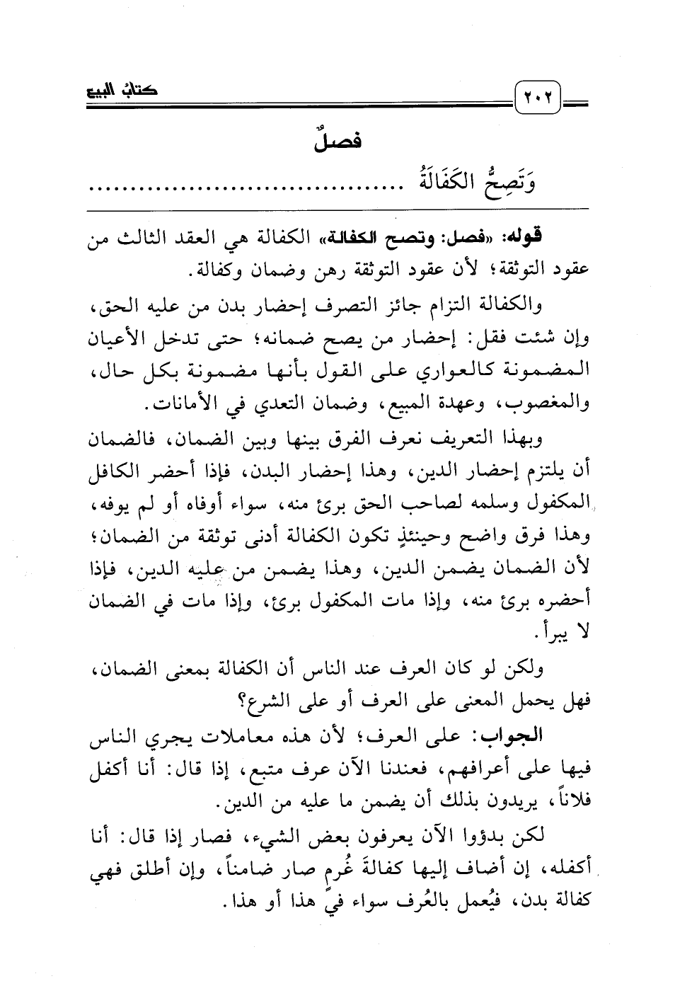 وبهذا التعريف نعرف الفرق بينها وبين الضمان، فالضمان أن يلتزم إحضار الدين، وهذا إحضار البدن، فإذا أحضر الكافل المكفول وسلمه لصاحب الحق برئ منه، سواء أوفاه أو لم يوفه، وهذا فرق واضح وحينئذٍ تكون الكفالة أدنى توثقة من الضمان؛ لأن الضمان يضمن الدين، وهذا يضمن من عليه الدين، فإذا أحضره برئ منه، وإذا مات المكفول برئ، وإذا مات في الضمان لا يبرأ.