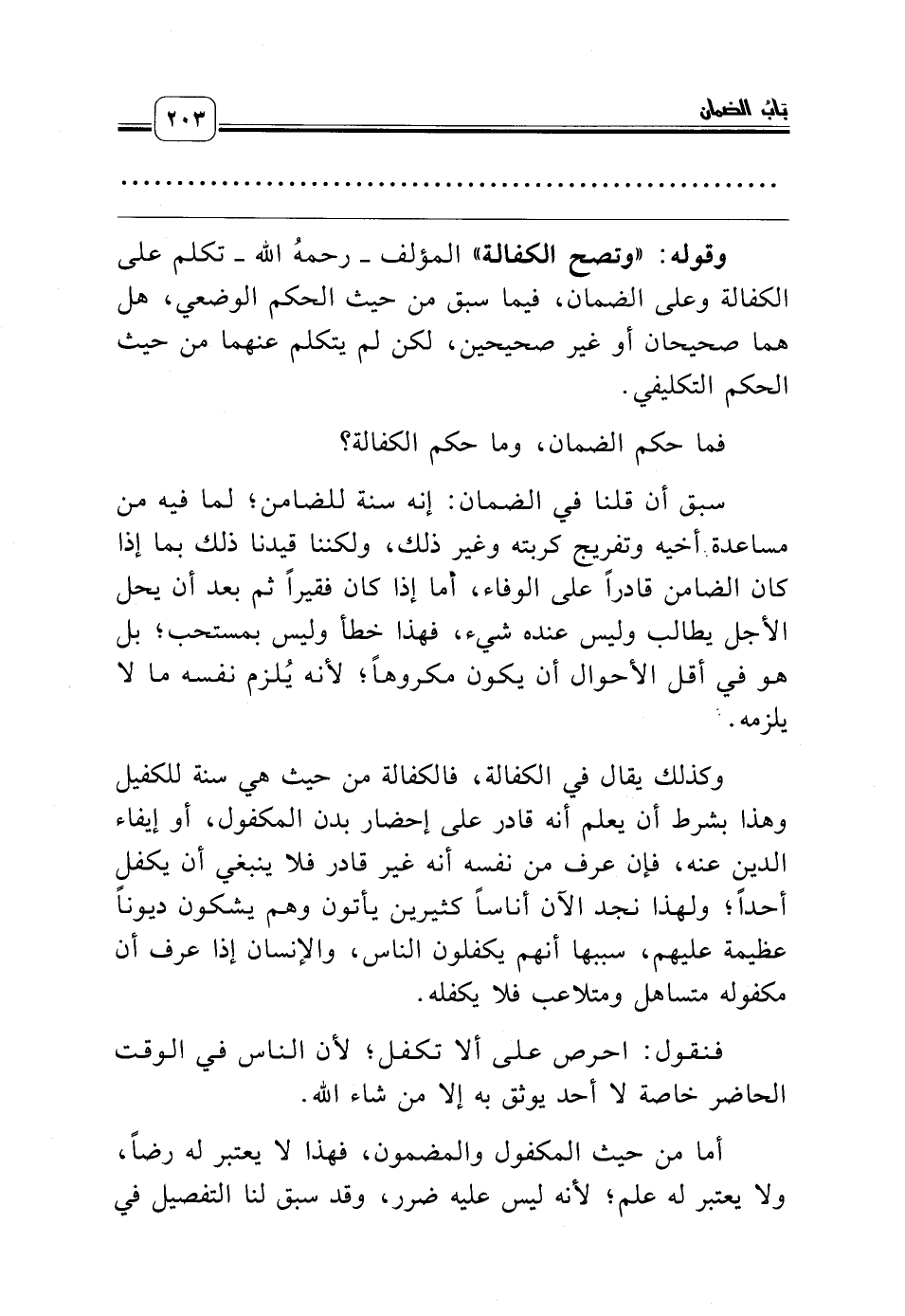 وكذلك يقال في الكفالة، فالكفالة من حيث هي سنة للكفيل وهذا بشرط أن يعلم أنه قادر على إحضار بدن المكفول، أو إيفاء الدين عنه، فإن عرف من نفسه أنه غير قادر فلا ينبغي أن يكفل أحداً؛ ولهذا نجد الآن أناساً كثيرين يأتون وهم يشكون ديوناً عظيمة عليهم، سببها أنهم يكفلون الناس، والإنسان إذا عرف أن مكفوله متساهل ومتلاعب فلا يكفله.