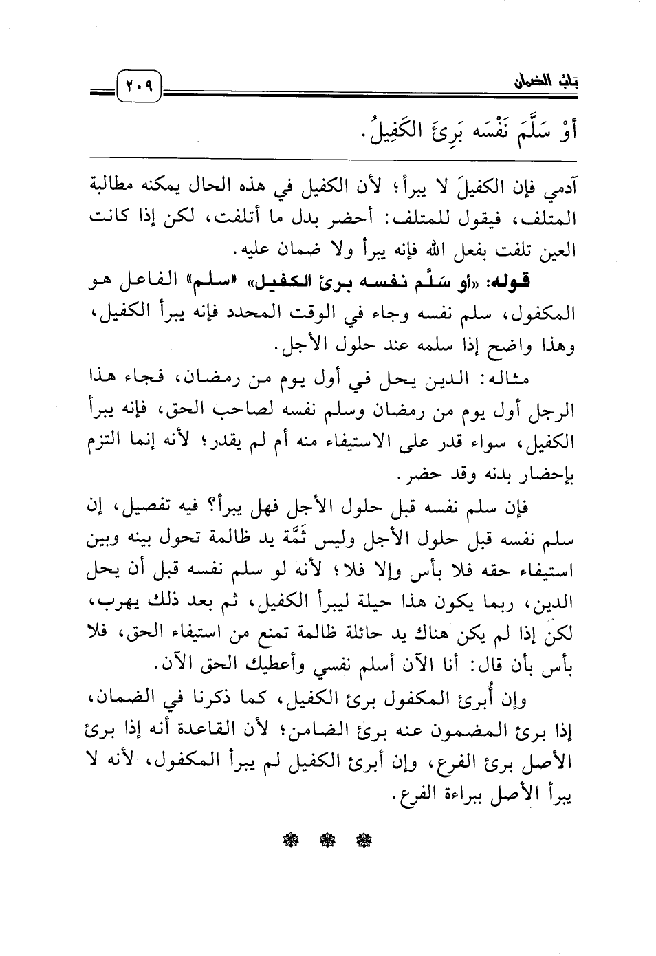 قوله: «أو سَلَّم نفسه برئ الكفيل» «سلم» الفاعل هو المكفول، سلم نفسه وجاء في الوقت المحدد فإنه يبرأ الكفيل، وهذا واضح إذا سلمه عند حلول الأجل.