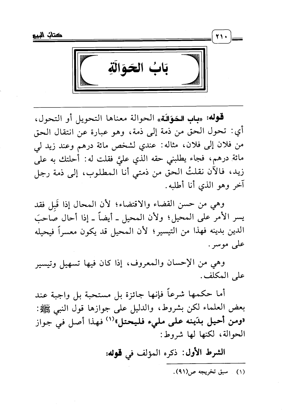 قوله: «باب الحَوَالَة» الحوالة معناها التحويل أو التحول، أي: تحول الحق من ذمة إلى ذمة، وهو عبارة عن انتقال الحق من فلان إلى فلان، مثاله: عندي لشخص مائة درهم وعند زيد لي مائة درهم، فجاء يطلبني حقه الذي عليَّ فقلت له: أحلتك به على زيد، فالآن نقلتُ الحق من ذمتي أنا المطلوب، إلى ذمة رجل آخر وهو الذي أنا أطلبه.