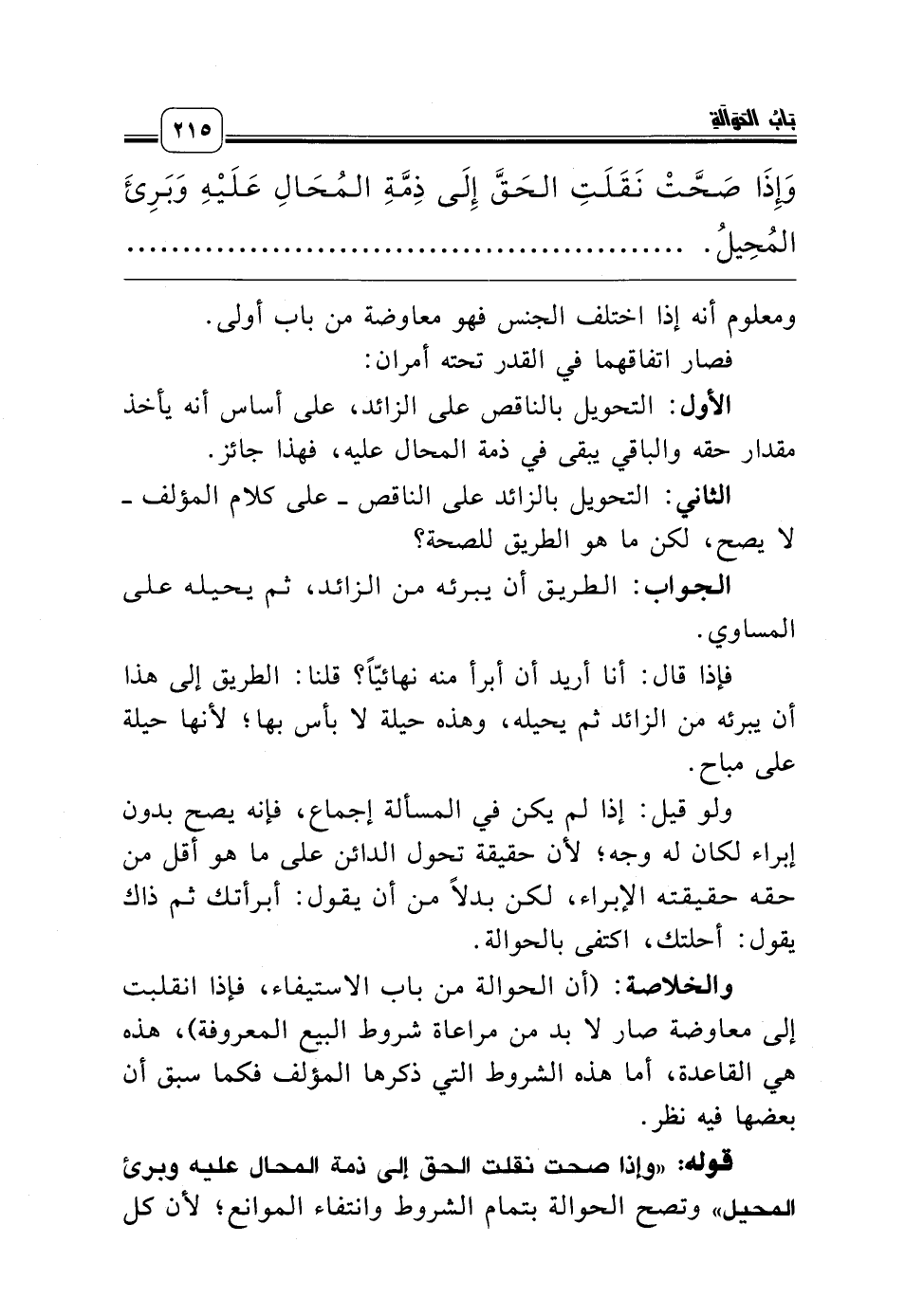 والخلاصة: (أن الحوالة من باب الاستيفاء، فإذا انقلبت إلى معاوضة صار لا بد من مراعاة شروط البيع المعروفة)، هذه هي القاعدة، أما هذه الشروط التي ذكرها المؤلف فكما سبق أن بعضها فيه نظر.