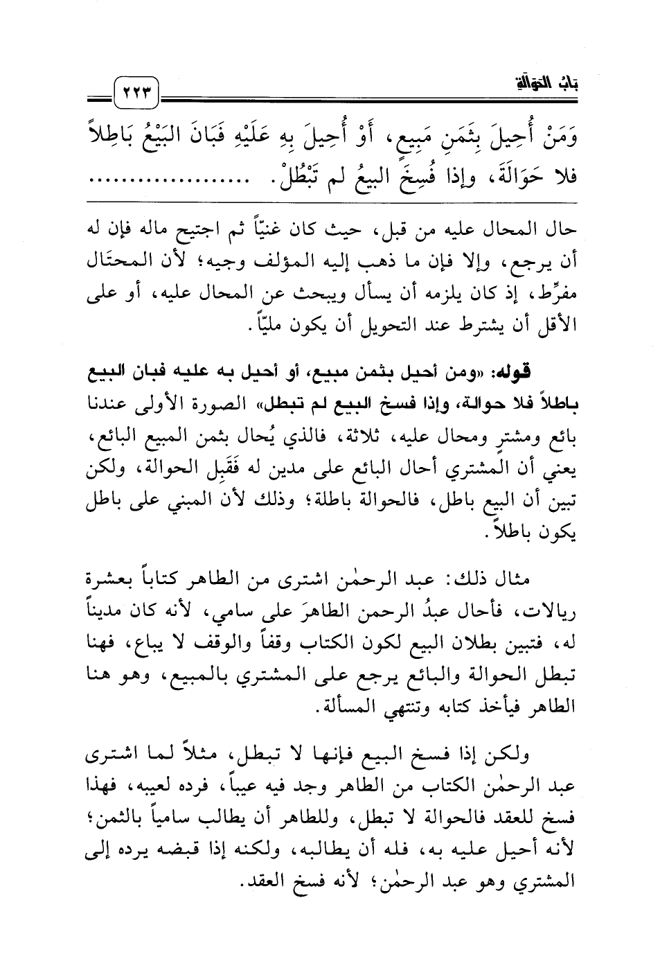 مثال ذلك: عبد الرحمن اشترى من الطاهر كتاباً بعشرة ريالات، فأحال عبدُ الرحمن الطاهرَ على سامي، لأنه كان مديناً له، فتبين بطلان البيع لكون الكتاب وقفاً والوقف لا يباع، فهنا تبطل الحوالة والبائع يرجع على المشتري بالمبيع، وهو هنا الطاهر فيأخذ كتابه وتنتهي المسألة.