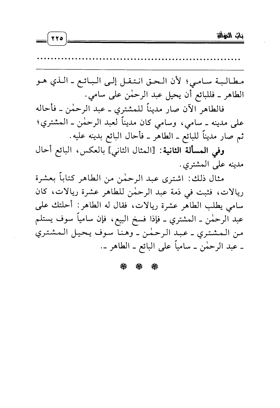 فالطاهر الآن صار مديناً للمشتري ـ عبد الرحمن ـ فأحاله على مدينه ـ سامي، وسامي كان مديناً لعبد الرحمن ـ المشتري؛ ثم صار مديناً للبائع ـ الطاهر ـ فأحال البائع بدينه عليه.