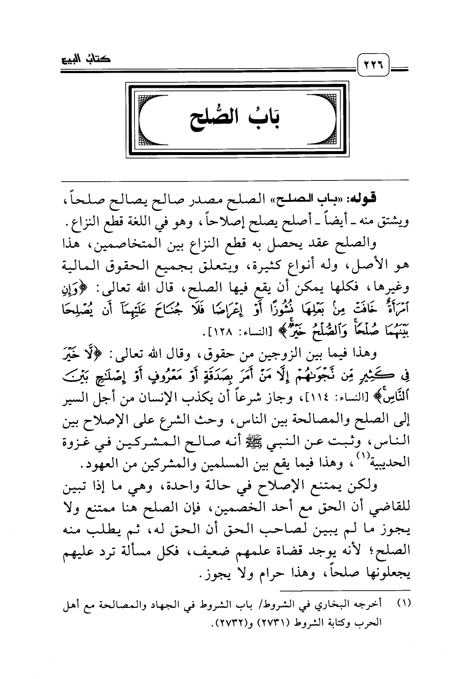قوله: «باب الصلح» الصلح مصدر صالح يصالح صلحاً، ويشتق منه ـ أيضاً ـ أصلح يصلح إصلاحاً، وهو في اللغة قطع النزاع.
