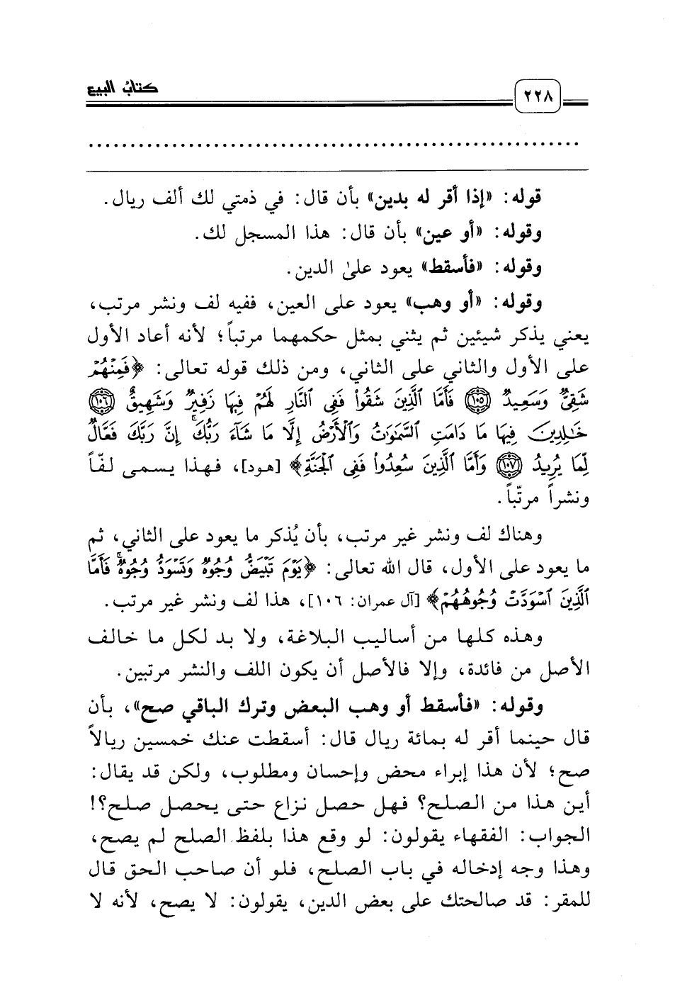 وقوله: «أو وهب» يعود على العين، ففيه لف ونشر مرتب، يعني يذكر شيئين ثم يثني بمثل حكمهما مرتباً؛ لأنه أعاد الأول على الأول والثاني على الثاني، ومن ذلك قوله تعالى: {فَمِنْهُمْ شَقِيٌّ وَسَعِيدٌ} {فَأَمَّا الَّذِينَ شَقُوا فَفِي النَّارِ لَهُمْ فِيهَا زَفِيرٌ وَشَهِيقٌ *خَالِدِينَ فِيهَا مَا دَامَتِ السَّمَاوَاتُ وَالأَرْضُ إِلاَّ مَا شَاءَ رَبُّكَ إِنَّ رَبَّكَ فَعَّالٌ لِمَا يُرِيدُ *} {وَأَمَّا الَّذِينَ سُعِدُوا فَفِي الْجَنَّةِ} [هود]، فهذا يسمى لفّاً ونشراً مرتّباً.