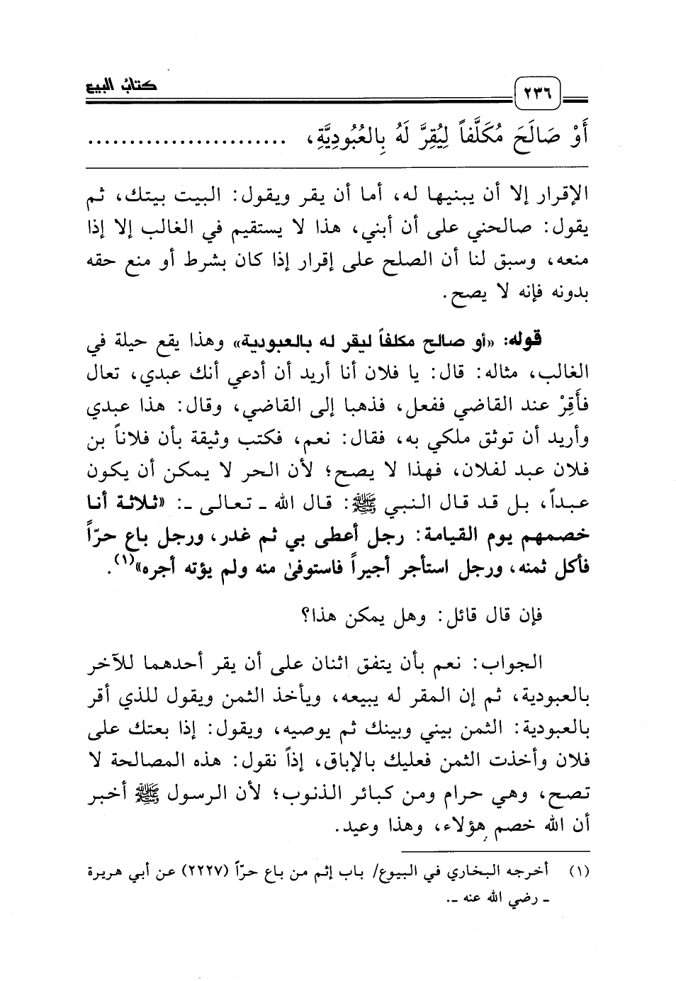 قوله: «أو صالح مكلفاً ليقر له بالعبودية» وهذا يقع حيلة في الغالب، مثاله: قال: يا فلان أنا أريد أن أدعي أنك عبدي، تعال فأَقِرْ عند القاضي ففعل، فذهبا إلى القاضي، وقال: هذا عبدي وأريد أن توثق ملكي به، فقال: نعم، فكتب وثيقة بأن فلاناً بن فلان عبد لفلان، فهذا لا يصح؛ لأن الحر لا يمكن أن يكون عبداً، بل قد قال النبي صلّى الله عليه وسلّم: قال الله ـ تعالى ـ: «ثلاثة أنا خصمهم يوم القيامة: رجل أعطى بي ثم غدر، ورجل باع حرّاً فأكل ثمنه، ورجل استأجر أجيراً فاستوفى منه ولم يؤته أجره» (¬1).
