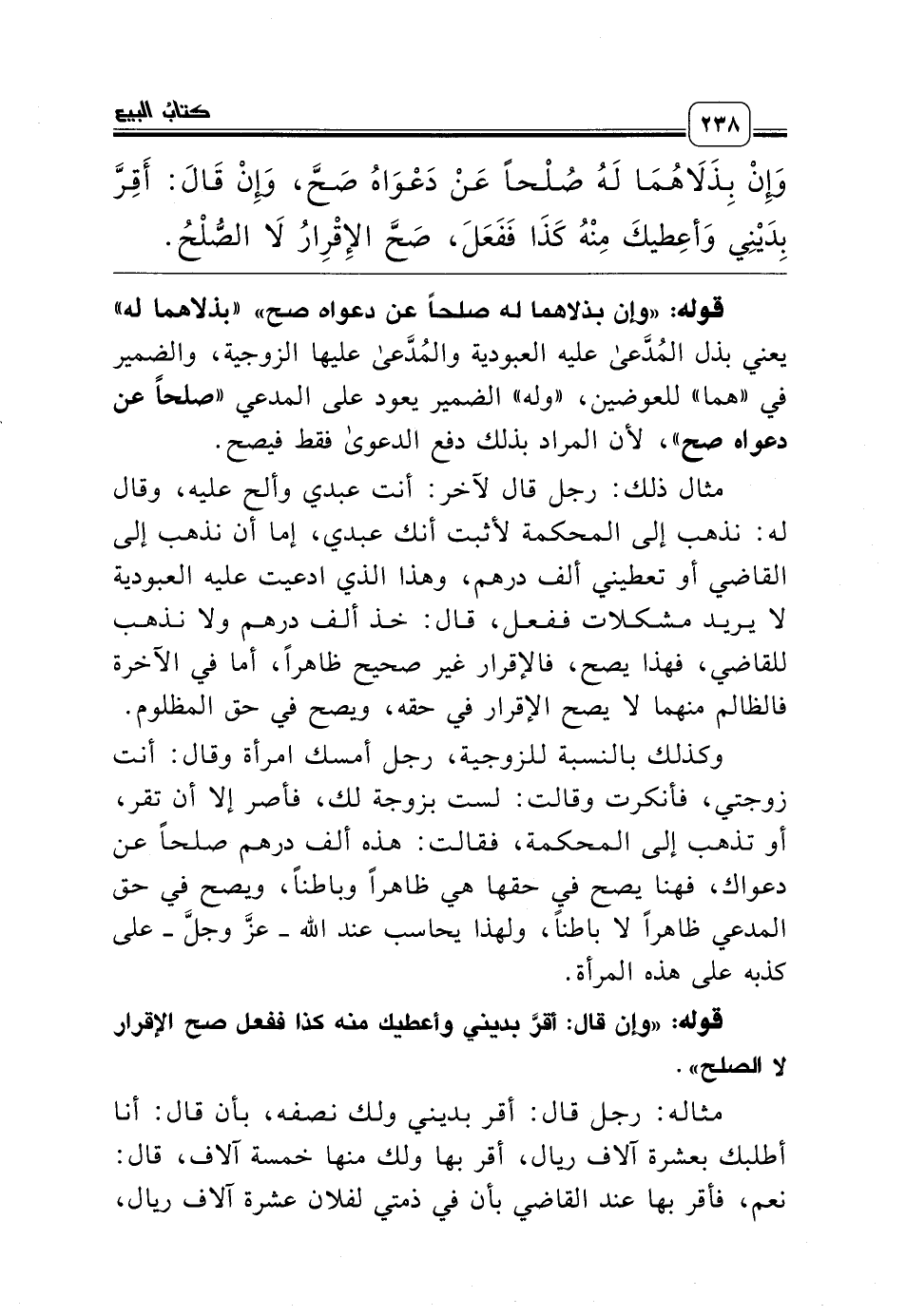قوله: «وإن بذلاهما له صلحاً عن دعواه صح» «بذلاهما له» يعني بذل المُدَّعى عليه العبودية والمُدَّعى عليها الزوجية، والضمير في «هما» للعوضين، «وله» الضمير يعود على المدعي «صلحاً عن دعواه صح»، لأن المراد بذلك دفع الدعوى فقط فيصح.