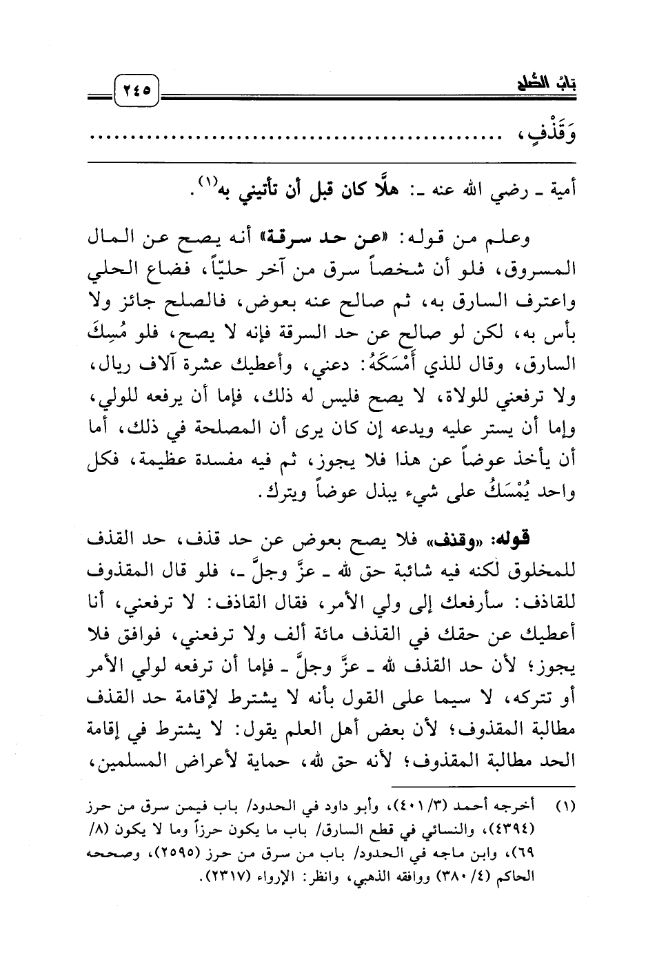 وعلم من قوله: «عن حد سرقة» أنه يصح عن المال المسروق، فلو أن شخصاً سرق من آخر حليّاً، فضاع الحلي واعترف السارق به، ثم صالح عنه بعوض، فالصلح جائز ولا بأس به، لكن لو صالح عن حد السرقة فإنه لا يصح، فلو مُسِكَ السارق، وقال للذي أَمْسَكَهُ: دعني، وأعطيك عشرة آلاف ريال، ولا ترفعني للولاة، لا يصح فليس له ذلك، فإما أن يرفعه للولي، وإما أن يستر عليه ويدعه إن كان يرى أن المصلحة في ذلك، أما أن يأخذ عوضاً عن هذا فلا يجوز، ثم فيه مفسدة عظيمة، فكل واحد يُمْسَكُ على شيء يبذل عوضاً ويترك.
