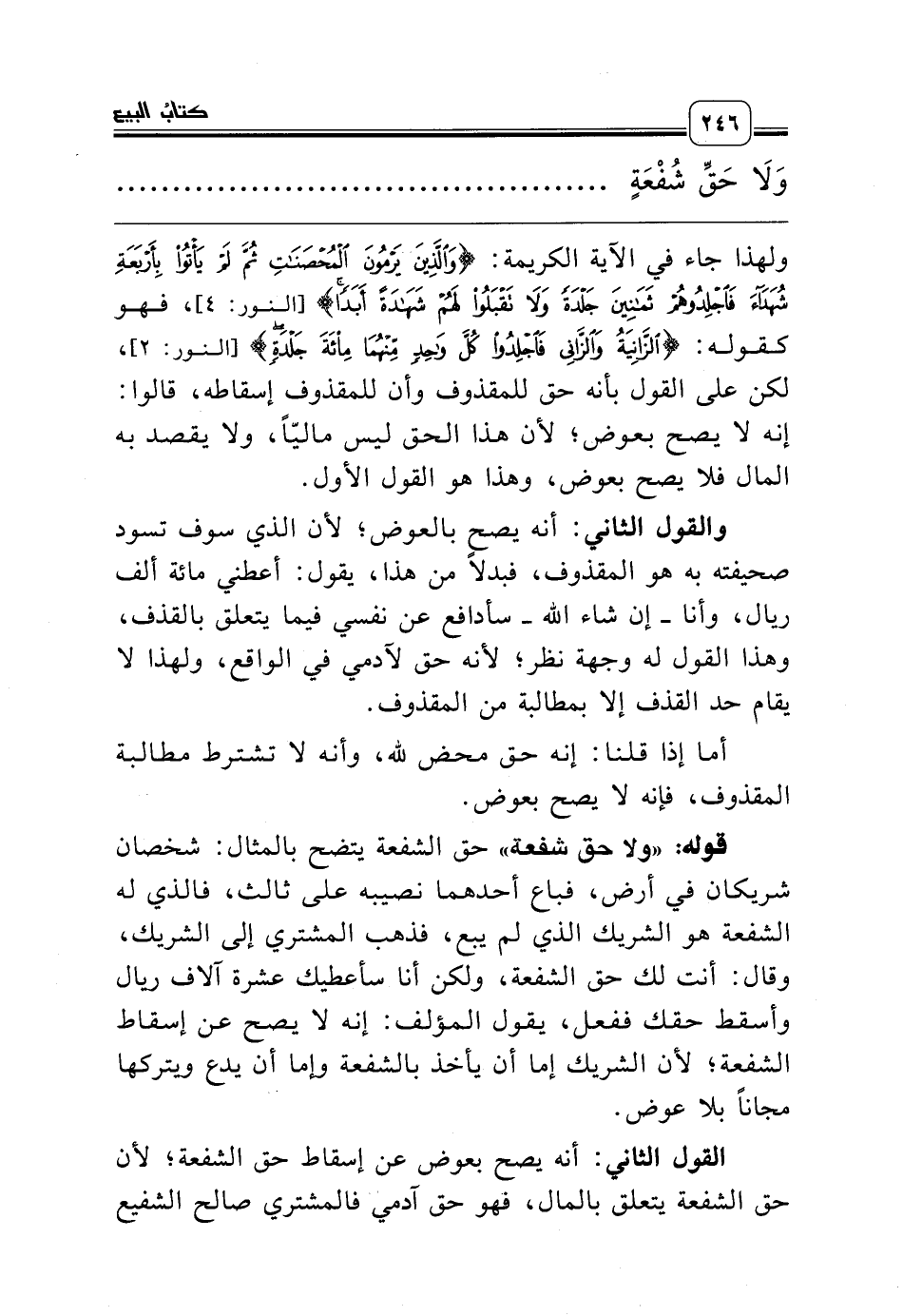 ولهذا جاء في الآية الكريمة: {وَالَّذِينَ يَرْمُونَ الْمُحْصَنَاتِ ثُمَّ لَمْ يَأْتُوا بِأَرْبَعَةِ شُهَدَاءَ فَاجْلِدُوهُمْ ثَمَانِينَ جَلْدَةً وَلاَ تَقْبَلُوا لَهُمْ شَهَادَةً أَبَدًا} [النور: 4]، فهو كقوله: {الزَّانِيَةُ وَالزَّانِي فَاجْلِدُوا كُلَّ وَاحِدٍ مِنْهُمَا مِئَةَ جَلْدَةٍ} [النور: 2]، لكن على القول بأنه حق للمقذوف وأن للمقذوف إسقاطه، قالوا: إنه لا يصح بعوض؛ لأن هذا الحق ليس ماليّاً، ولا يقصد به المال فلا يصح بعوض، وهذا هو القول الأول.
