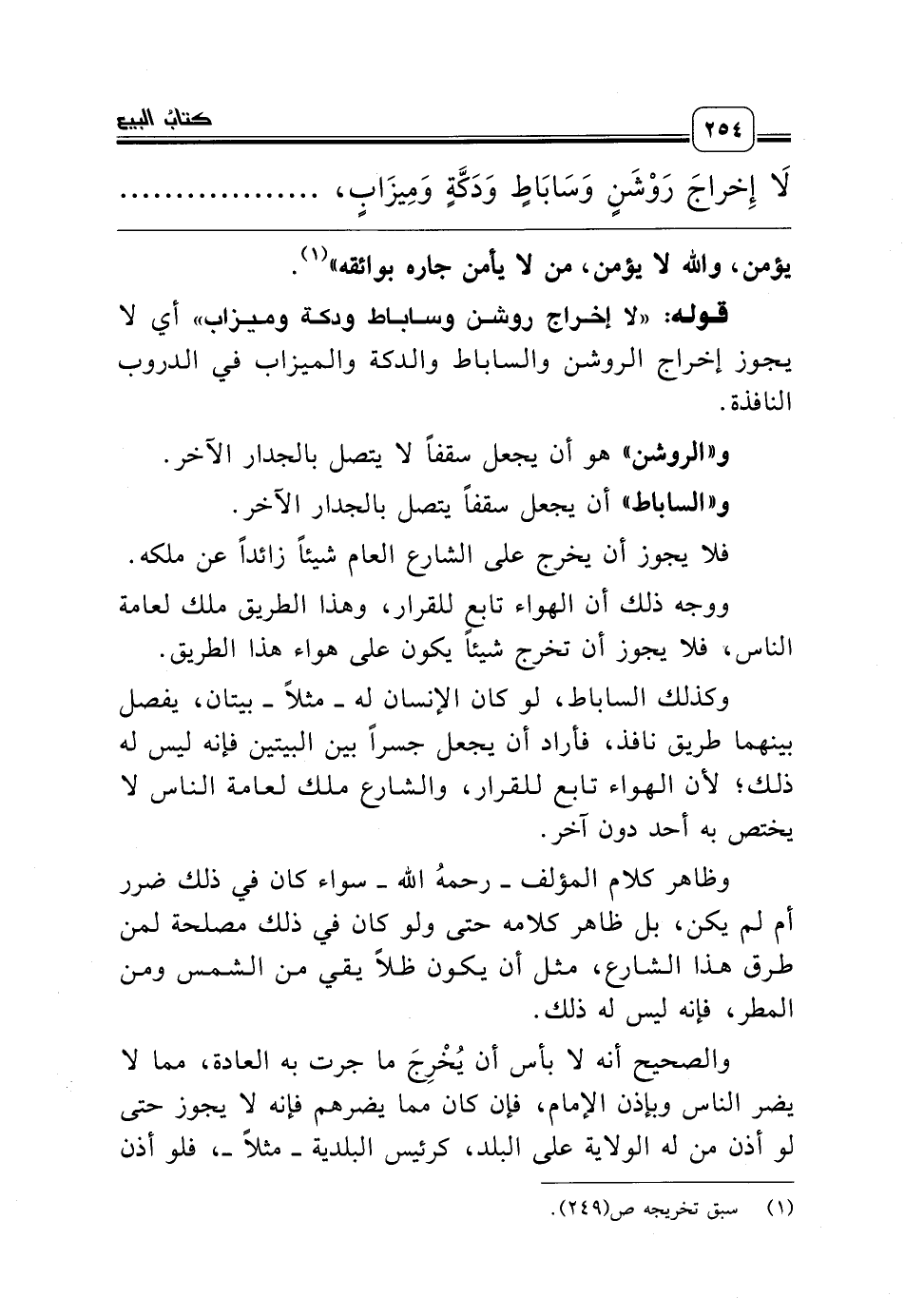 قوله: «لا إخراج روشن وساباط ودكة وميزاب» أي لا يجوز إخراج الروشن والساباط والدكة والميزاب في الدروب النافذة.