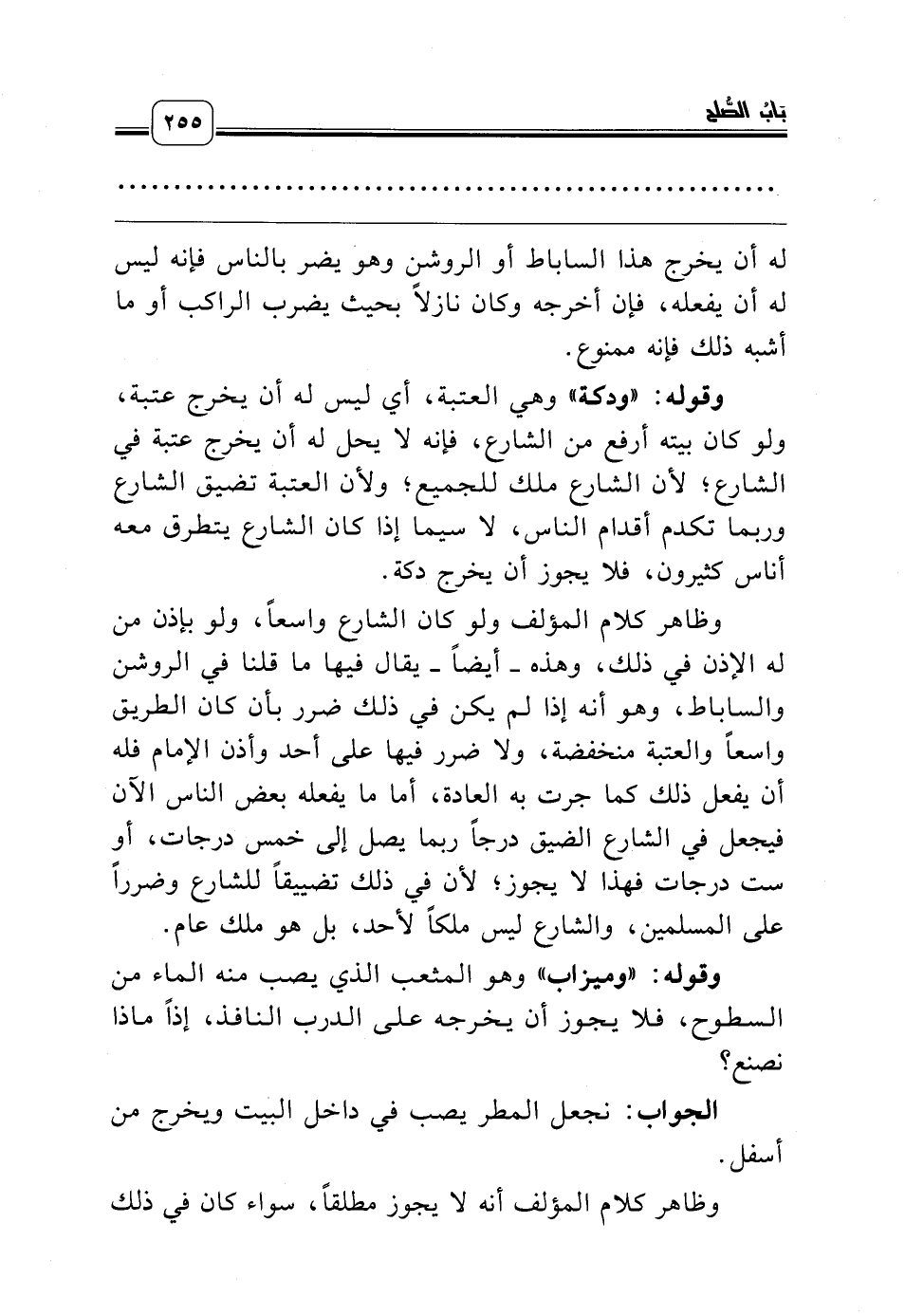 وقوله: «وميزاب» وهو المثعب الذي يصب منه الماء من السطوح، فلا يجوز أن يخرجه على الدرب النافذ، إذاً ماذا نصنع؟