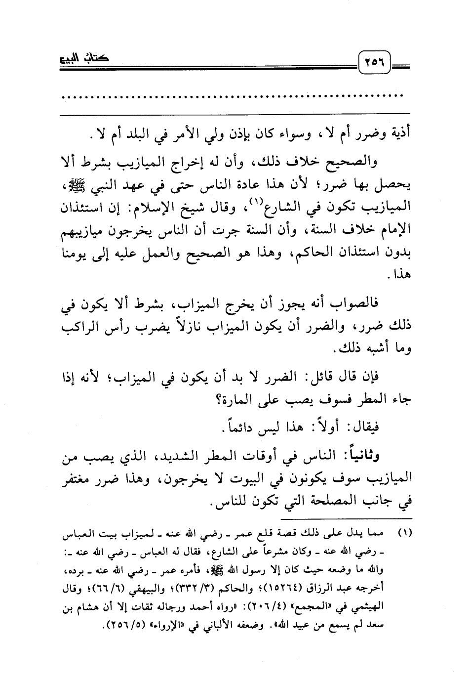 (¬1) مما يدل على ذلك قصة قلع عمر ـ رضي الله عنه ـ لميزاب بيت العباس ـ رضي الله عنه ـ وكان مشرعاً على الشارع، فقال له العباس ـ رضي الله عنه ـ: والله ما وضعه حيث كان إلا رسول الله صلّى الله عليه وسلّم، فأمره عمر ـ رضي الله عنه ـ برده، أخرجه عبد الرزاق (15264)؛ والحاكم (3/ 332)؛ والبيهقي (6/ 66)؛ وقال الهيثمي في «المجمع» (4/ 206): «رواه أحمد ورجاله ثقات إلا أن هشام بن سعد لم يسمع من عبيد الله». وضعفه الألباني في «الإرواء» (5/ 256).