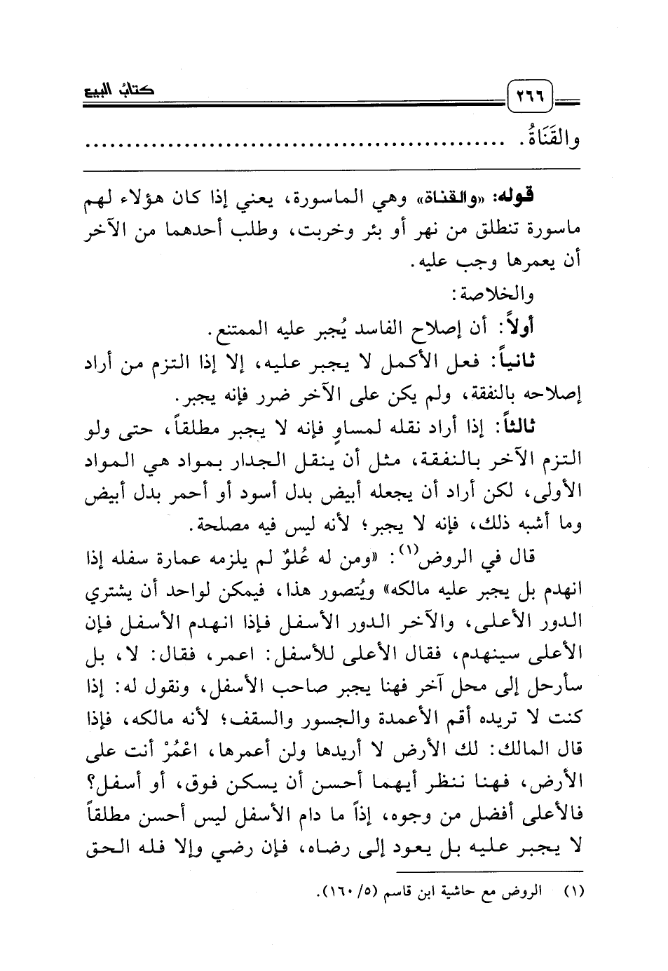 قوله: «والقناة» وهي الماسورة، يعني إذا كان هؤلاء لهم ماسورة تنطلق من نهر أو بئر وخربت، وطلب أحدهما من الآخر أن يعمرها وجب عليه.