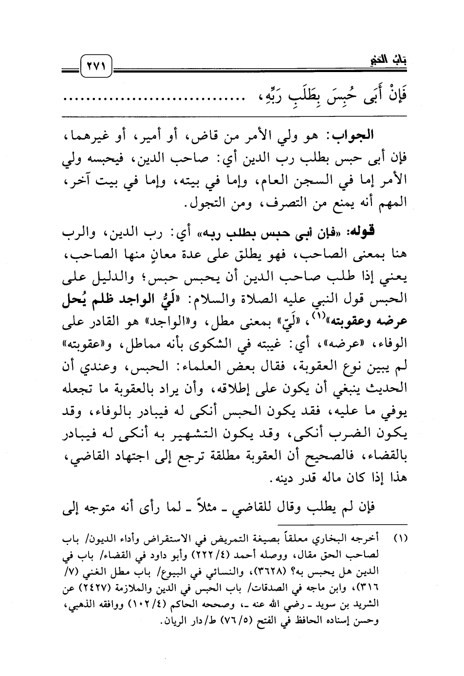 (¬1) أخرجه البخاري معلقاً بصيغة التمريض في الاستقراض وأداء الديون/ باب لصاحب الحق مقال، ووصله أحمد (4/ 222) وأبو داود في القضاء/ باب في الدين هل يحبس به؟ (3628)، والنسائي في البيوع/ باب مطل الغني (7/ 316)، وابن ماجه في الصدقات/ باب الحبس في الدين والملازمة (2427) عن الشريد بن سويد ـ رضي الله عنه ـ، وصححه الحاكم (4/ 102) ووافقه الذهبي، وحسن إسناده الحافظ في الفتح (5/ 76) ط/دار الريان.
