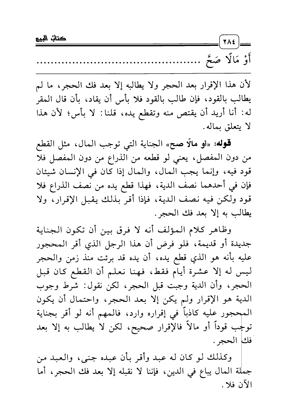 قوله: «أو مالاً صح» الجناية التي توجب المال، مثل القطع من دون المفصل، يعني لو قطعه من الذراع من دون المفصل فلا قود فيه، وإنما يجب المال، والمال إذا كان في الإنسان شيئان فإن في أحدهما نصف الدية، فهذا قطع يده من نصف الذراع فلا قود ولكن فيه نصف الدية، فإذا أقر بذلك يقبل الإقرار، ولا يطالب به إلا بعد فك الحجر.