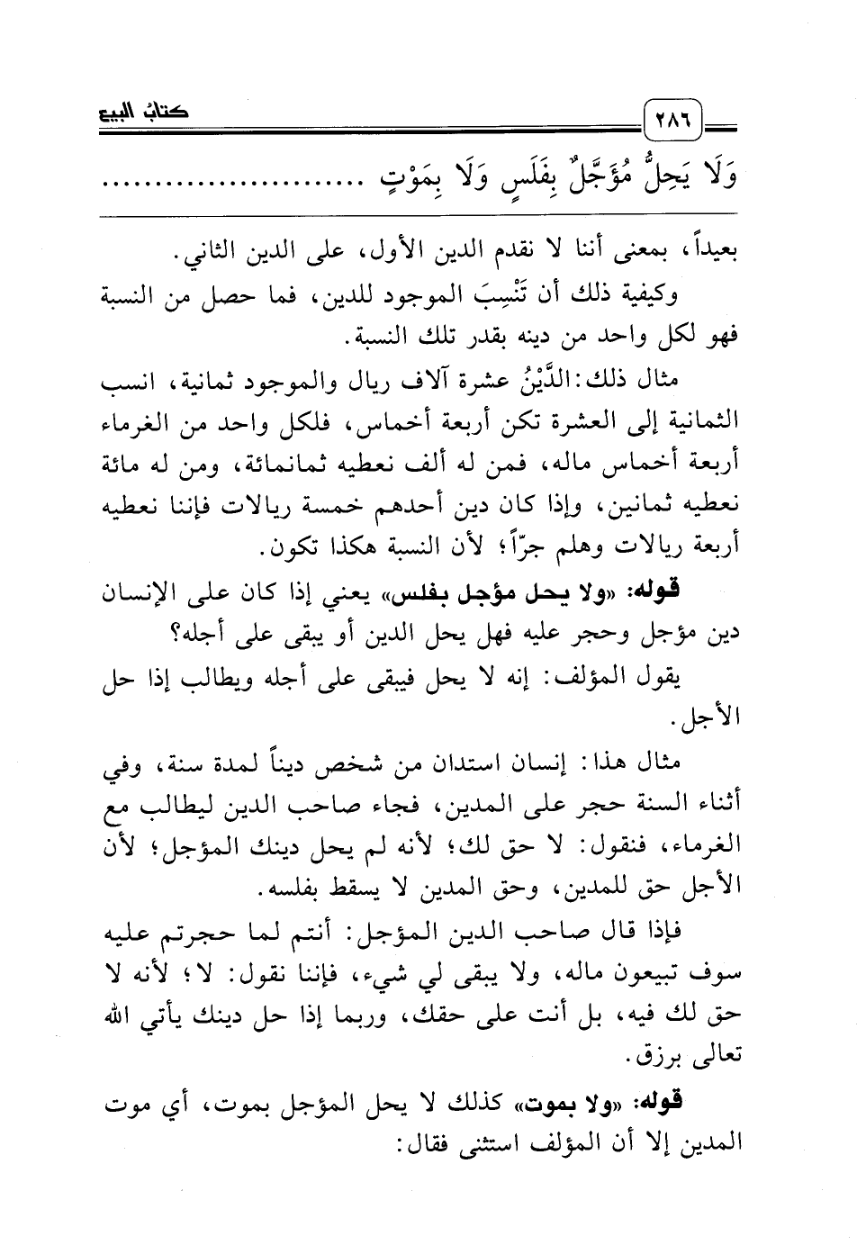 قوله: «ولا يحل مؤجل بفلس» يعني إذا كان على الإنسان دين مؤجل وحجر عليه فهل يحل الدين أو يبقى على أجله؟