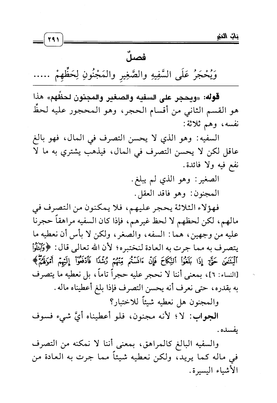 وَيُحْجَرُ عَلَى السَّفِيهِ والصَّغِيرِ والمَجْنُونِ لِحَظِّهِمْ وَمَنْ أعْطَاهُمْ مَالَهُ بَيْعَاً أَوْ قَرْضَاً رَجَعَ بِعَيْنِهِ، وَإِنْ أتْلَفُوهُ لَمْ يَضْمَنُوا،
