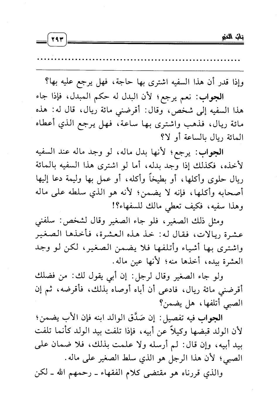 الجواب: يرجع؛ لأنها بدل ماله، لو وجد ماله عند السفيه لأخذه، فكذلك إذا وجد بدله، أما لو اشترى هذا السفيه بالمائة ريال حلوى وأكلها، أو بطيخاً وأكله، أو عمل بها وليمة دعا إليها أصحابه وأكلها، فإنه لا يضمن؛ لأنه هو الذي سلطه على ماله وهذا سفيه، فكيف تعطي مالك للسفهاء؟!