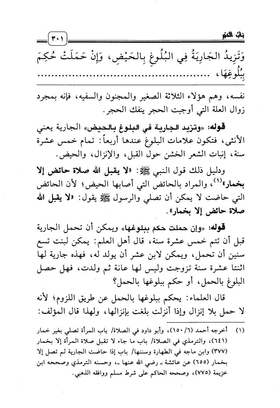 (¬1) أخرجه أحمد (6/ 150)، وأبو داود في الصلاة/ باب المرأة تصلي بغير خمار (641)، والترمذي في الصلاة/ باب ما جاء لا تقبل صلاة المرأة إلا بخمار (377) وابن ماجه في الطهارة وسننها/ باب إذا حاضت الجارية لم تصل إلا بخمار (655) عن عائشة ـ رضي الله عنها ـ، وحسنه الترمذي وصححه ابن خزيمة (775)، وصححه الحاكم على شرط مسلم ووافقه الذهبي.