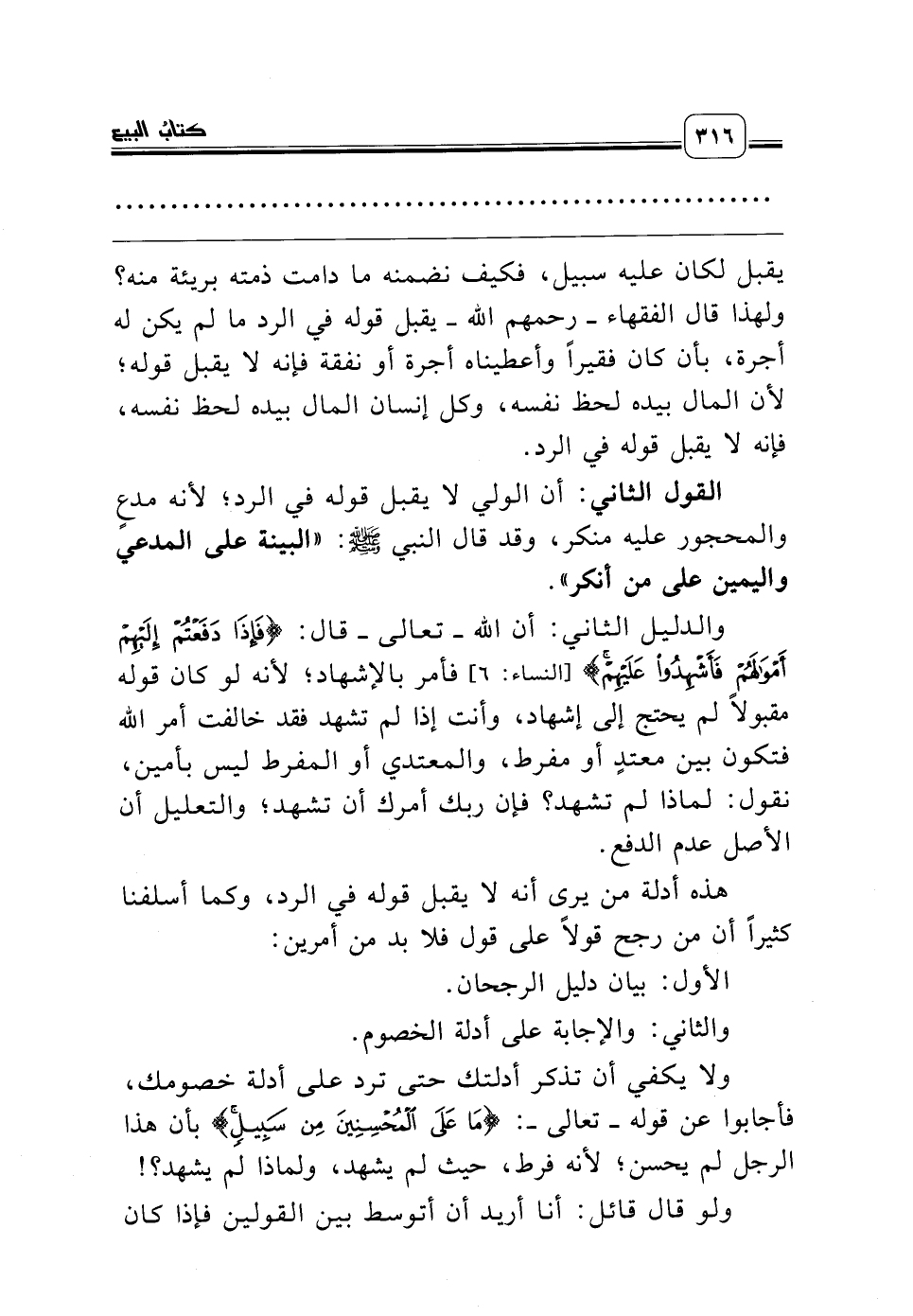 والدليل الثاني: أن الله ـ تعالى ـ قال: {فَإِذَا دَفَعْتُمْ إِلَيْهِمْ أَمْوَالَهُمْ فَأَشْهِدُوا عَلَيْهِمْ} [النساء: 6] فأمر بالإشهاد؛ لأنه لو كان قوله مقبولاً لم يحتج إلى إشهاد، وأنت إذا لم تشهد فقد خالفت أمر الله فتكون بين معتدٍ أو مفرط، والمعتدي أو المفرط ليس بأمين، نقول: لماذا لم تشهد؟ فإن ربك أمرك أن تشهد؛ والتعليل أن الأصل عدم الدفع.