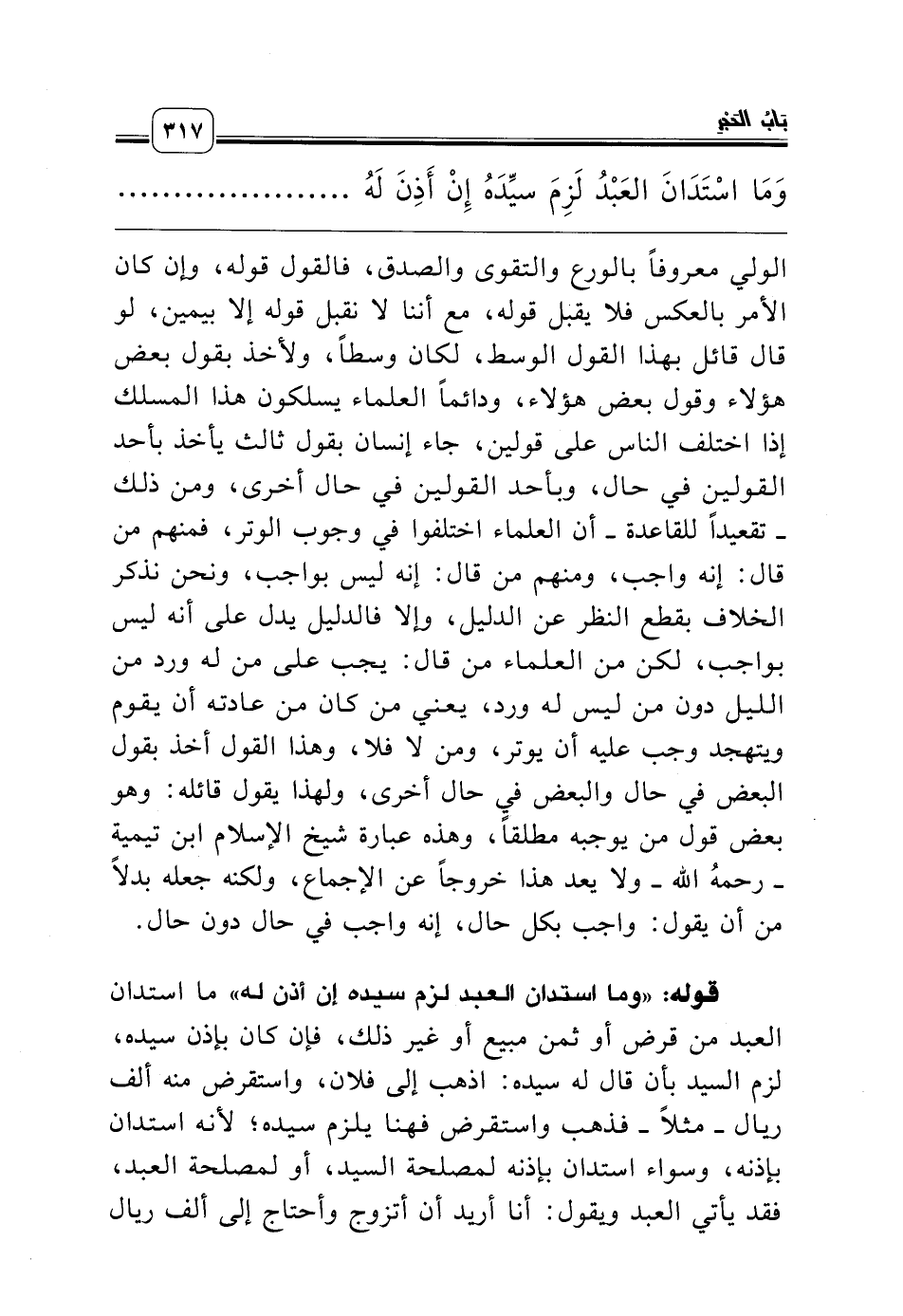 قوله: «وما استدان العبد لزم سيده إن أذن له» ما استدان العبد من قرض أو ثمن مبيع أو غير ذلك، فإن كان بإذن سيده، لزم السيد بأن قال له سيده: اذهب إلى فلان، واستقرض منه ألف ريال ـ مثلاً ـ فذهب واستقرض فهنا يلزم سيده؛ لأنه استدان بإذنه، وسواء استدان بإذنه لمصلحة السيد، أو لمصلحة العبد، فقد يأتي العبد ويقول: أنا أريد أن أتزوج وأحتاج إلى ألف ريال