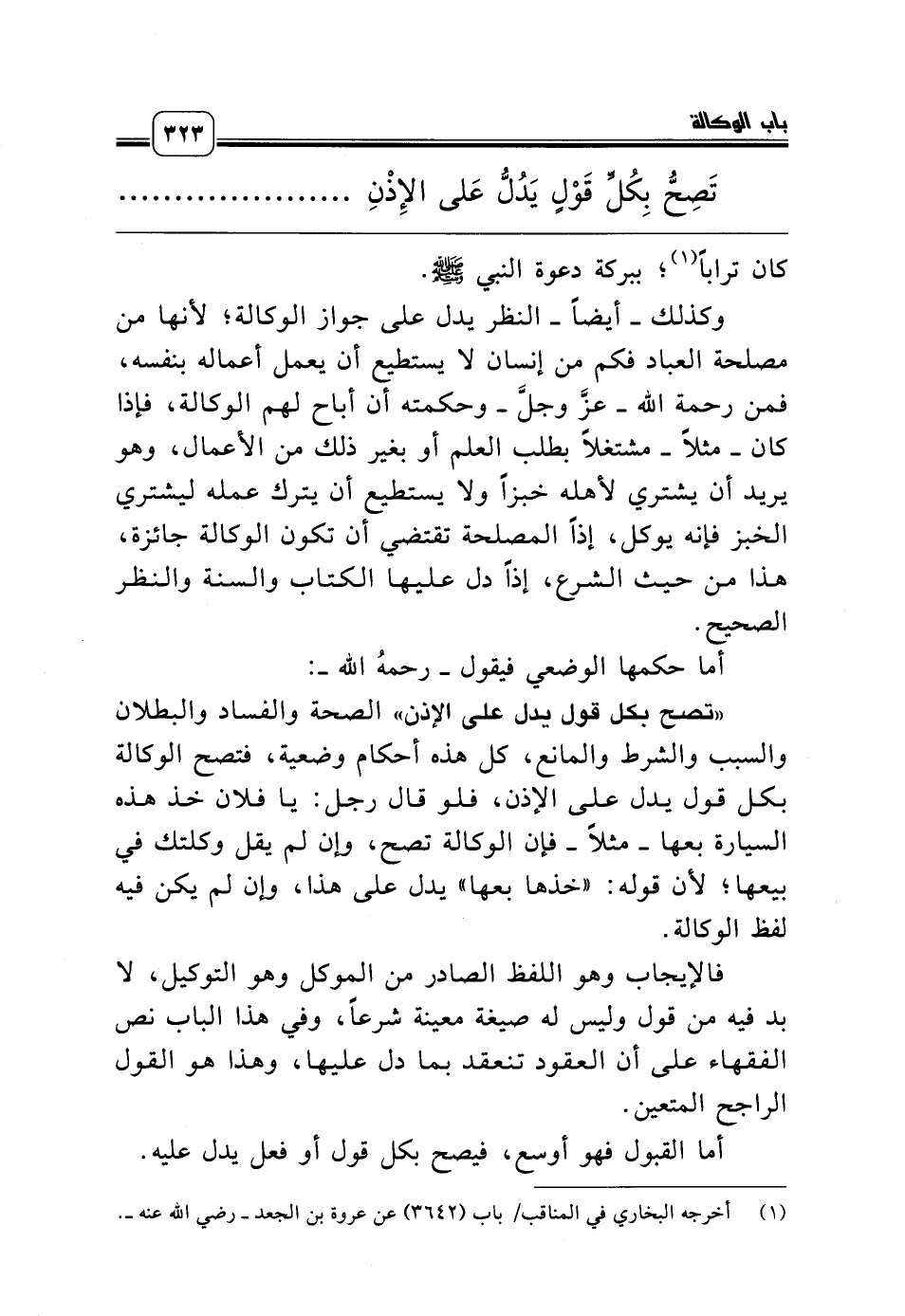 تَصِحُّ بِكُلِّ قَوْلٍ يَدُلُّ عَلى الإِذْنِ وَيَصِحُّ القَبُولُ عَلَى الفَوْرِ والتَّراخِي بِكُلِّ قَوْلٍ أَوْ فِعْلٍ دَالٍّ عَلَيْهِ ومَنْ لَهُ التَّصَرُّفُ فِي شيءٍ فَلَهُ التَّوْكِيلُ والتوكُّلُ فِيهِ ........