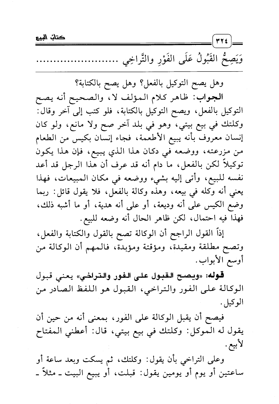 قوله: «ويصح القبول على الفور والتراخي» يعني قبول الوكالة على الفور والتراخي، القبول هو اللفظ الصادر من الوكيل.