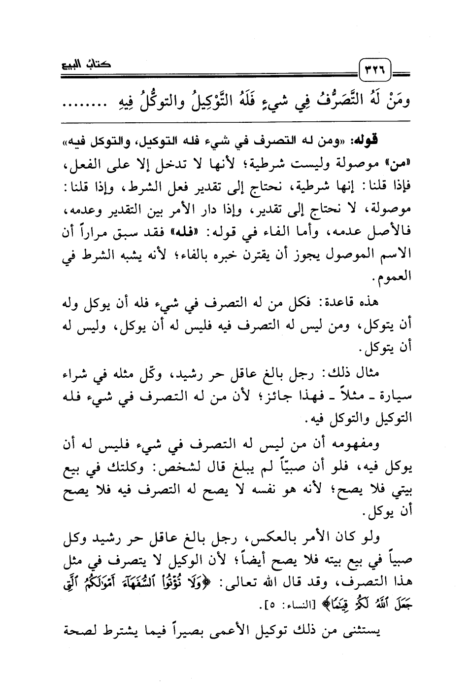 قوله: «ومن له التصرف في شيء فله التوكيل، والتوكل فيه» «من» موصولة وليست شرطية؛ لأنها لا تدخل إلا على الفعل، فإذا قلنا: إنها شرطية، نحتاج إلى تقدير فعل الشرط، وإذا قلنا: موصولة، لا نحتاج إلى تقدير، وإذا دار الأمر بين التقدير وعدمه، فالأصل عدمه، وأما الفاء في قوله: «فله» فقد سبق مراراً أن الاسم الموصول يجوز أن يقترن خبره بالفاء؛ لأنه يشبه الشرط في العموم.