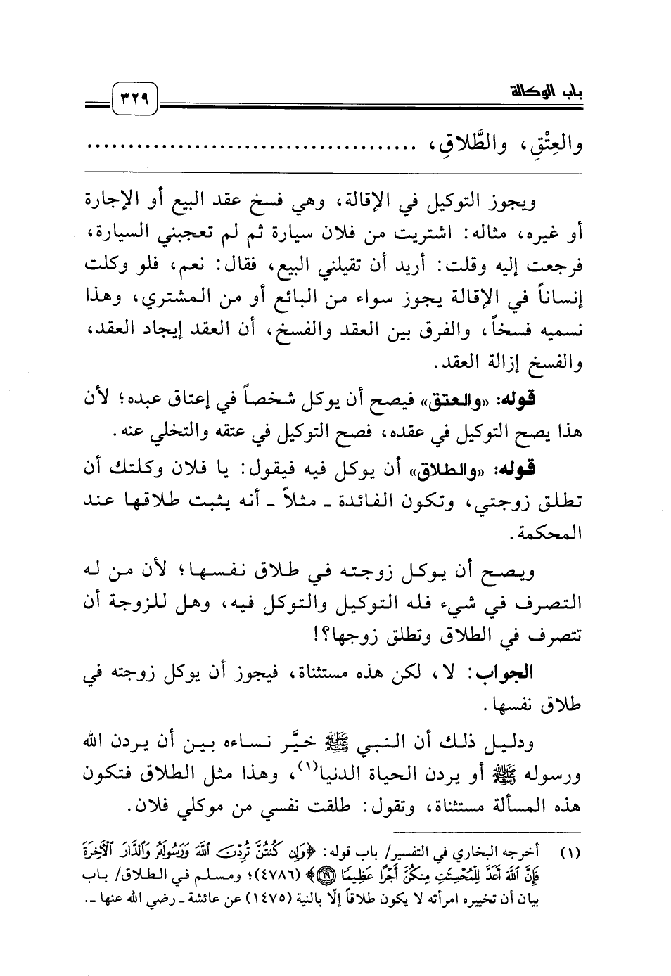 ودليل ذلك أن النبي صلّى الله عليه وسلّم خيَّر نساءه بين أن يردن الله ورسوله صلّى الله عليه وسلّم أو يردن الحياة الدنيا (¬1)، وهذا مثل الطلاق فتكون هذه المسألة مستثناة، وتقول: طلقت نفسي من موكلي فلان.